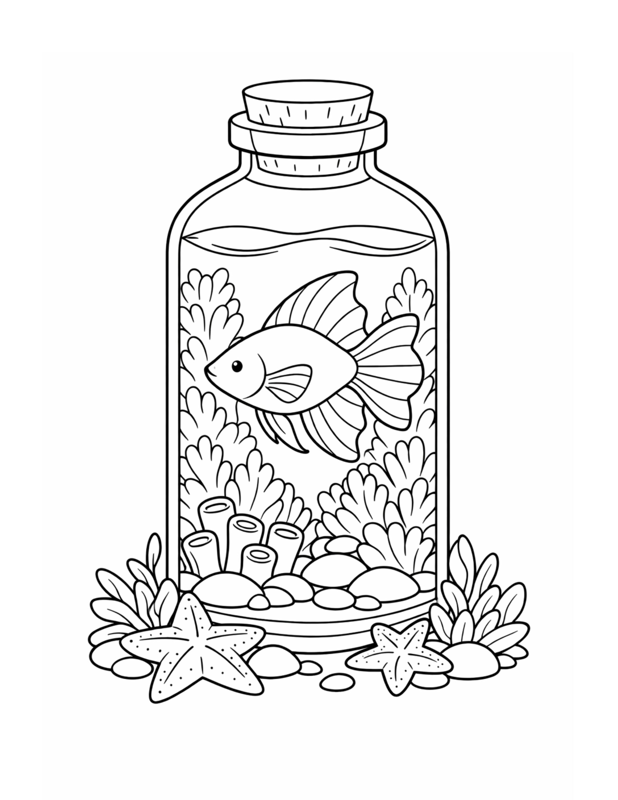 As you color the smooth curves of the jar and fins, you build fine motor control through steady, careful strokes. At the same time, choosing colors for glass, water, and plants supports creativity and helps you plan a balanced palette. In addition, the repeated leaf shapes encourage concentration, since they invite slow shading and gentle blending. Ultimately, the calm “mini aquarium” scene promotes relaxation, making this page a comforting break for kids, teens, or adults.