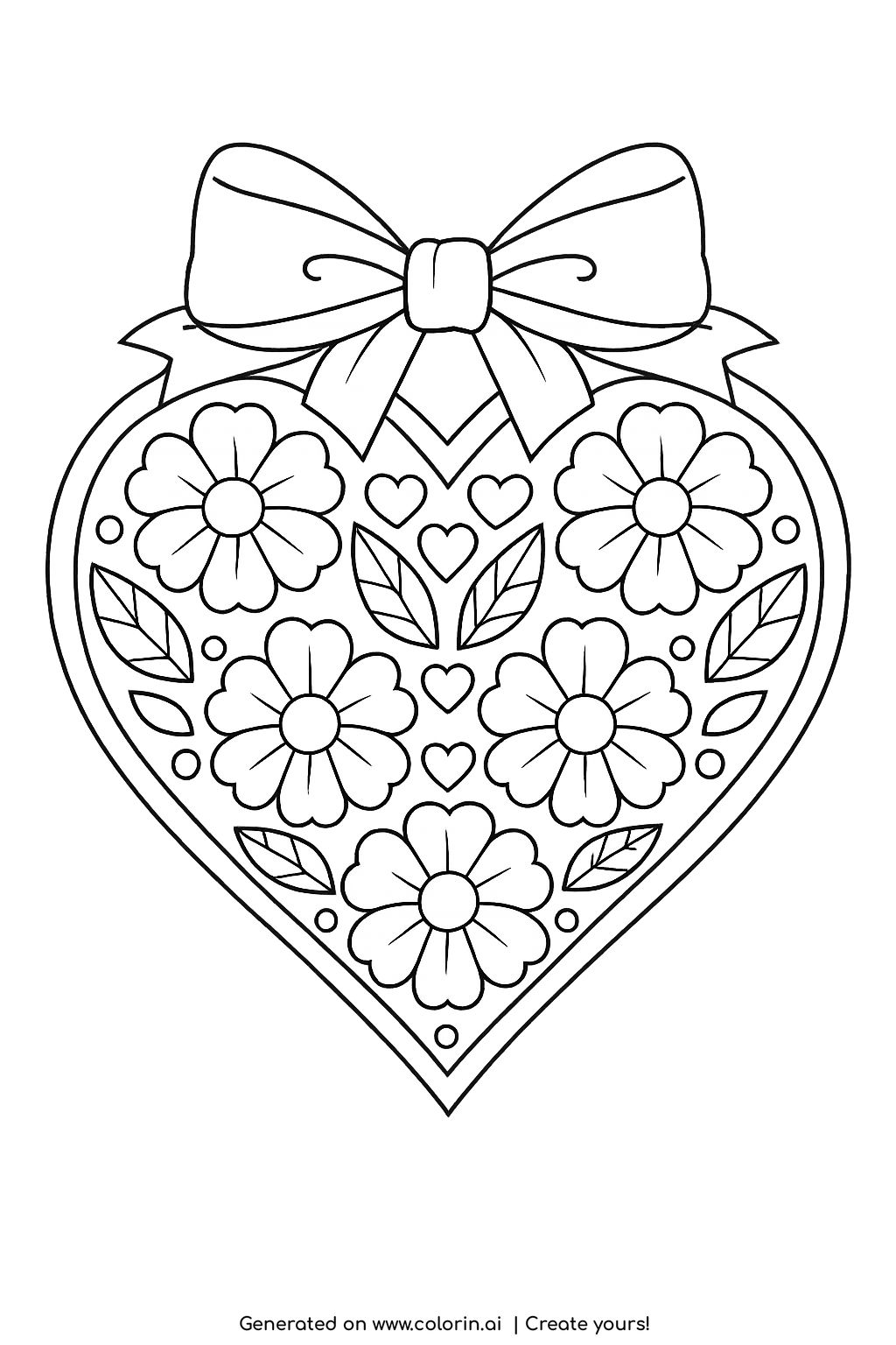 For this page, we entered the concept: a heart with a large bow at the top, filled with a repeating ornamental pattern of flowers, leaves, and small hearts arranged symmetrically on Colorin AI and generated a print ready coloring page in seconds. Then we added elegant and decorative details to make the scene feel more alive, all in just a few minutes. As a result, the floral heart with bow ornament coloring page offers a refined and visually pleasing design. You can follow the same process to create your own coloring pages, or build full coloring books without any design skills. For more creative inspiration, visit our profile on Pinterest.