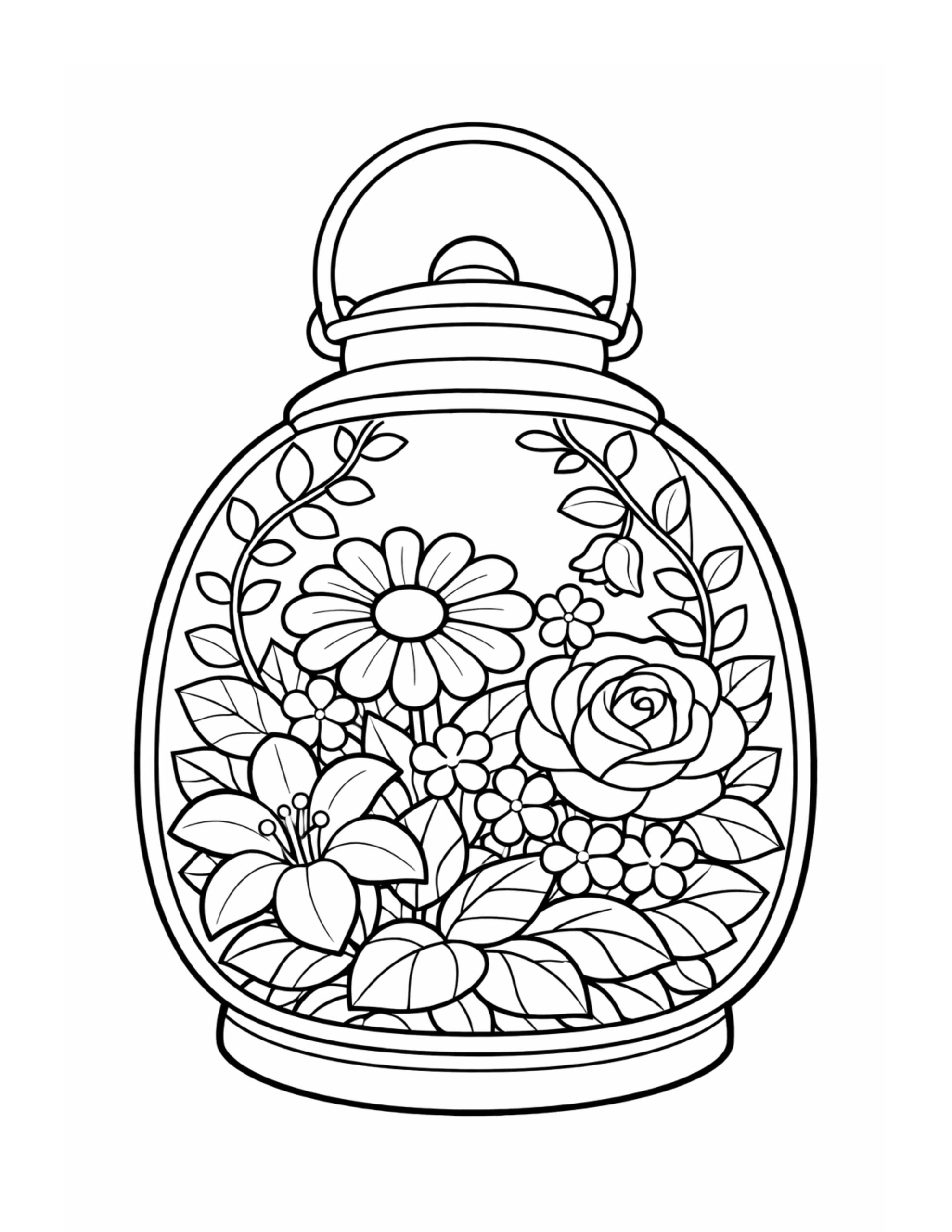 To begin, try a soft color palette for the petals, and then choose one brighter accent color to help a main bloom stand out. Next, shade the leaves with two greens, because a darker edge instantly adds depth around the clusters. Meanwhile, you can give the lantern a subtle “glass” feel by leaving a few thin highlights uncolored and blending light gray near the sides. Finally, gentle layering works well here, since the overlapping petals look richer with gradual pressure changes.