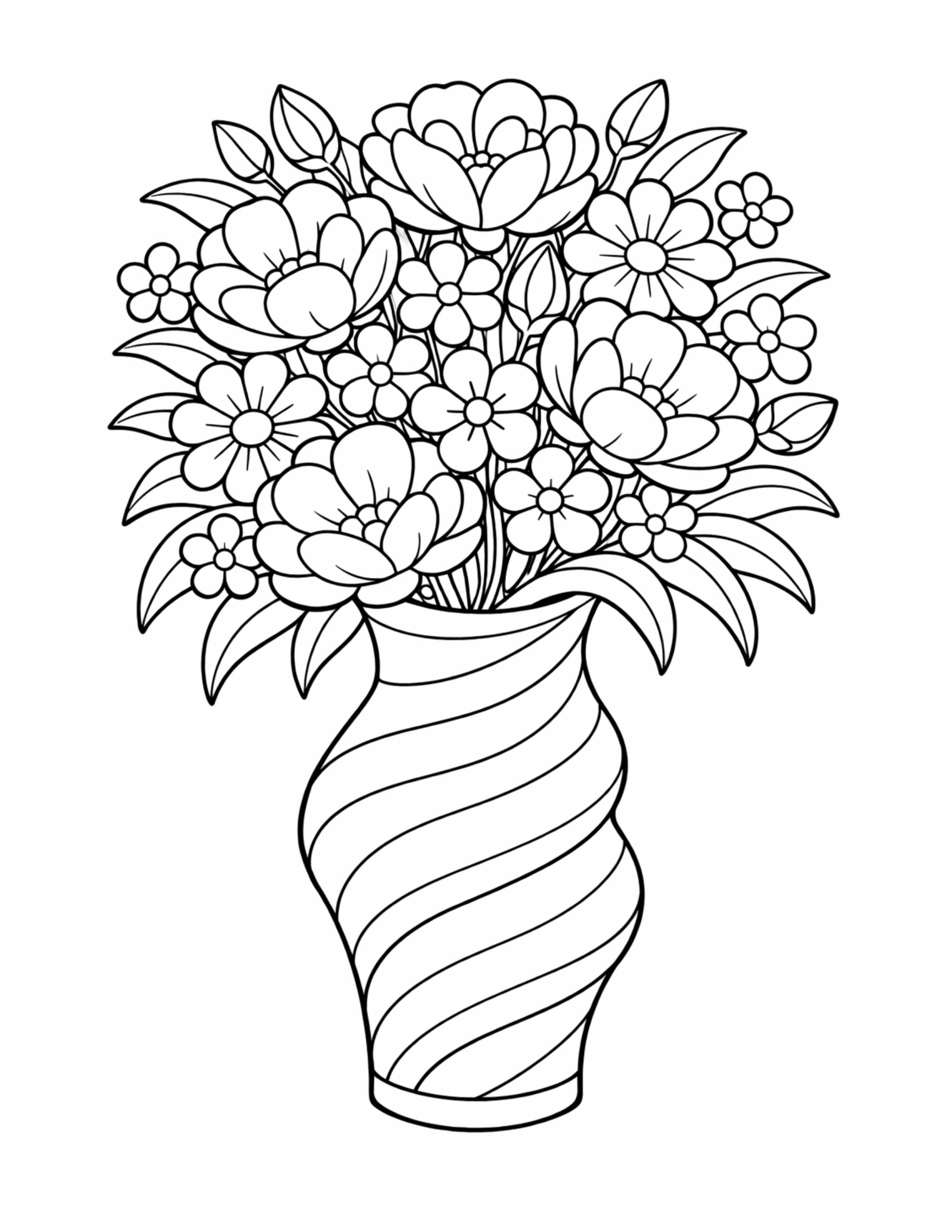 This flower bouquet in swirl vase coloring page features a full, rounded arrangement with layered blossoms, tiny filler flowers, and long leaves. At first glance, the bouquet feels airy and balanced, with plenty of open spaces between petals. Plus, the striped vase adds a smooth pattern that is satisfying to shade and blend.