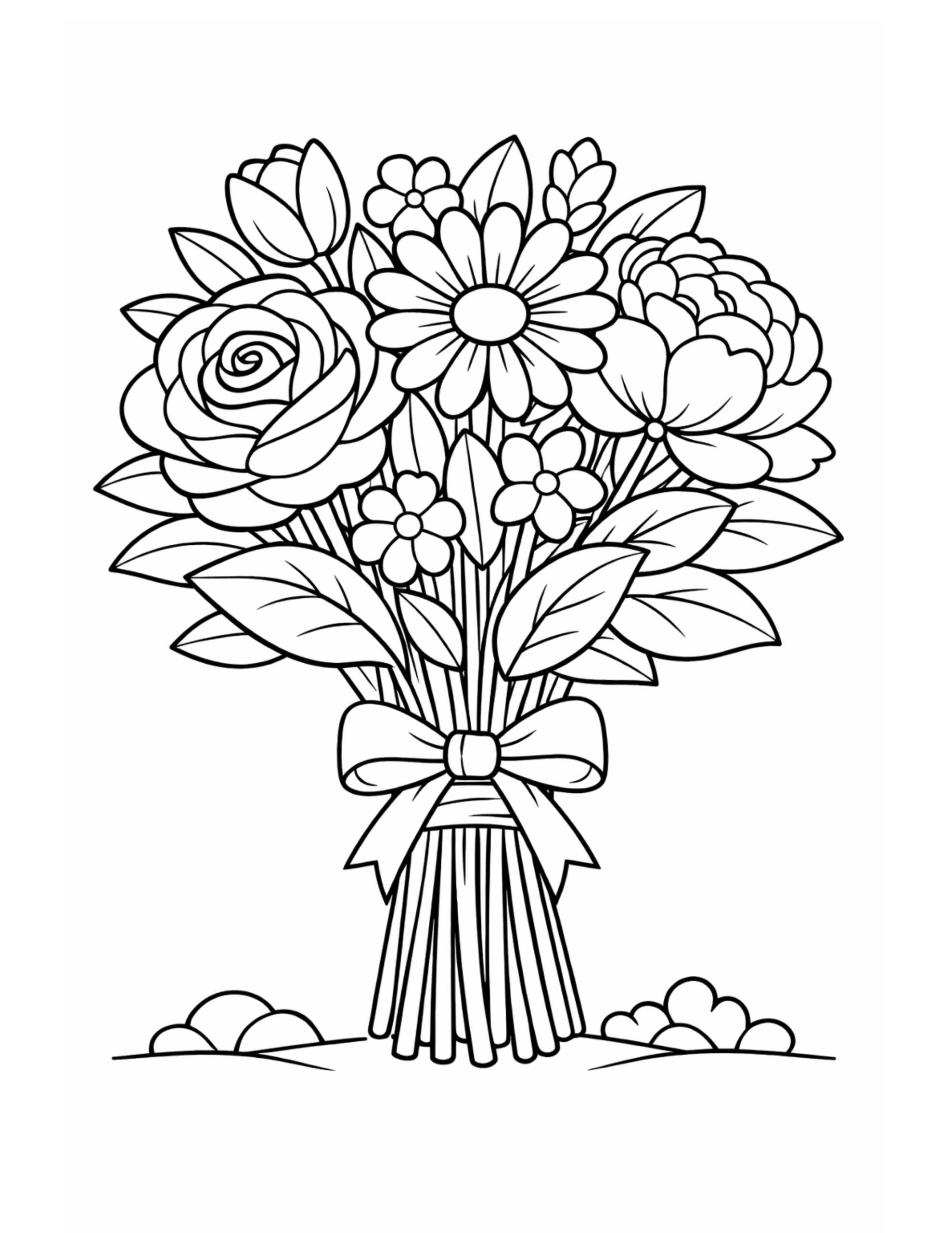 This flower bouquet tied with ribbon coloring page features a beautifully arranged group of blooms gathered together with a soft bow at the stems. At first glance, the floral shapes feel balanced and elegant, making the illustration calming to explore. As a result, this page is especially fun to color because each flower offers its own space for creativity.