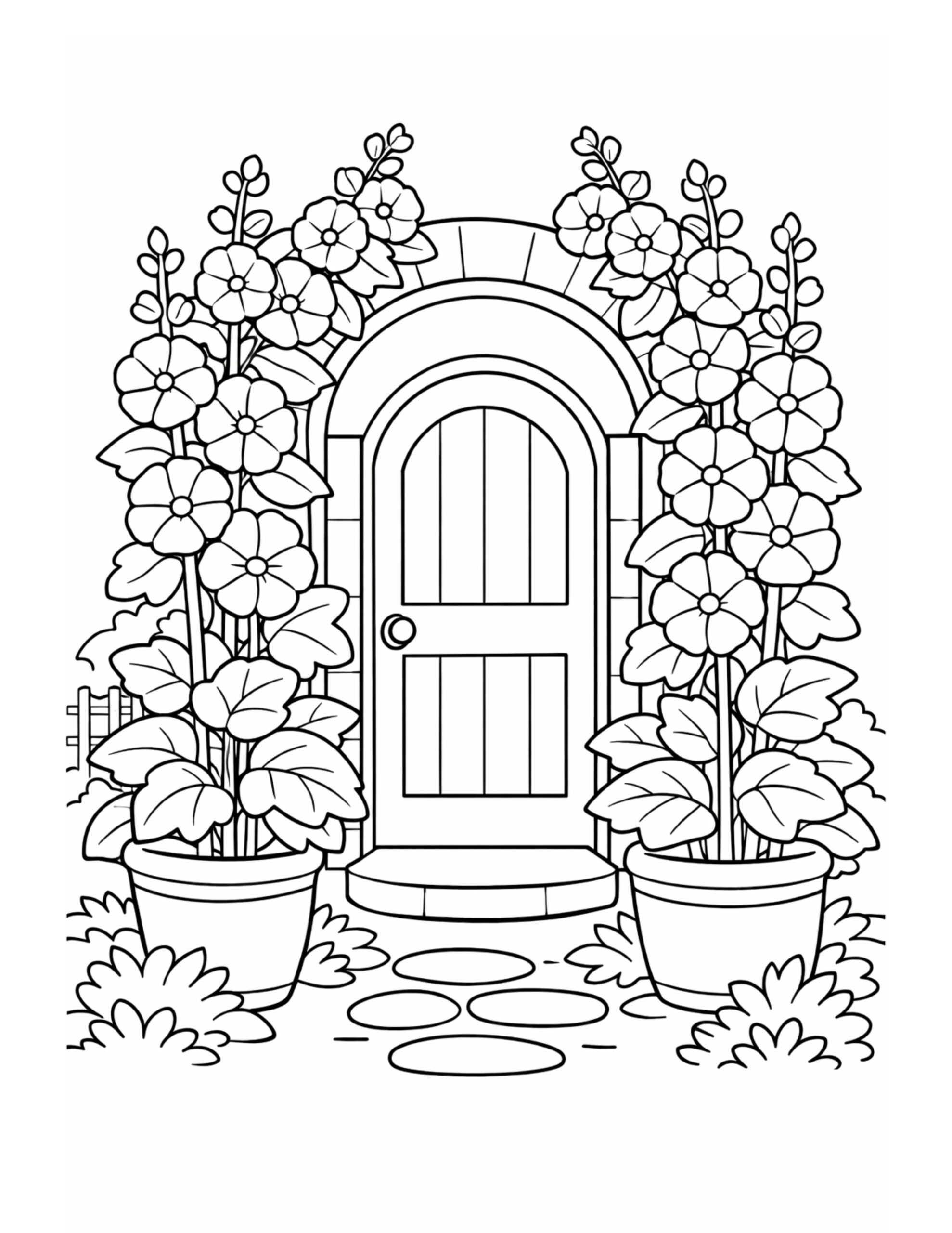 To begin, try warm neutrals for the door, then deepen the panels with slightly darker shading for a carved-wood look. Next, use two greens on the leaves, because a darker outline instantly adds depth around the flower clusters. Meanwhile, give the blooms a repeating palette, such as soft pinks and sunny yellows, so both sides feel balanced. Finally, color the stone arch with light grays and gentle texture lines, which helps the doorway stand out without overpowering the flowers.