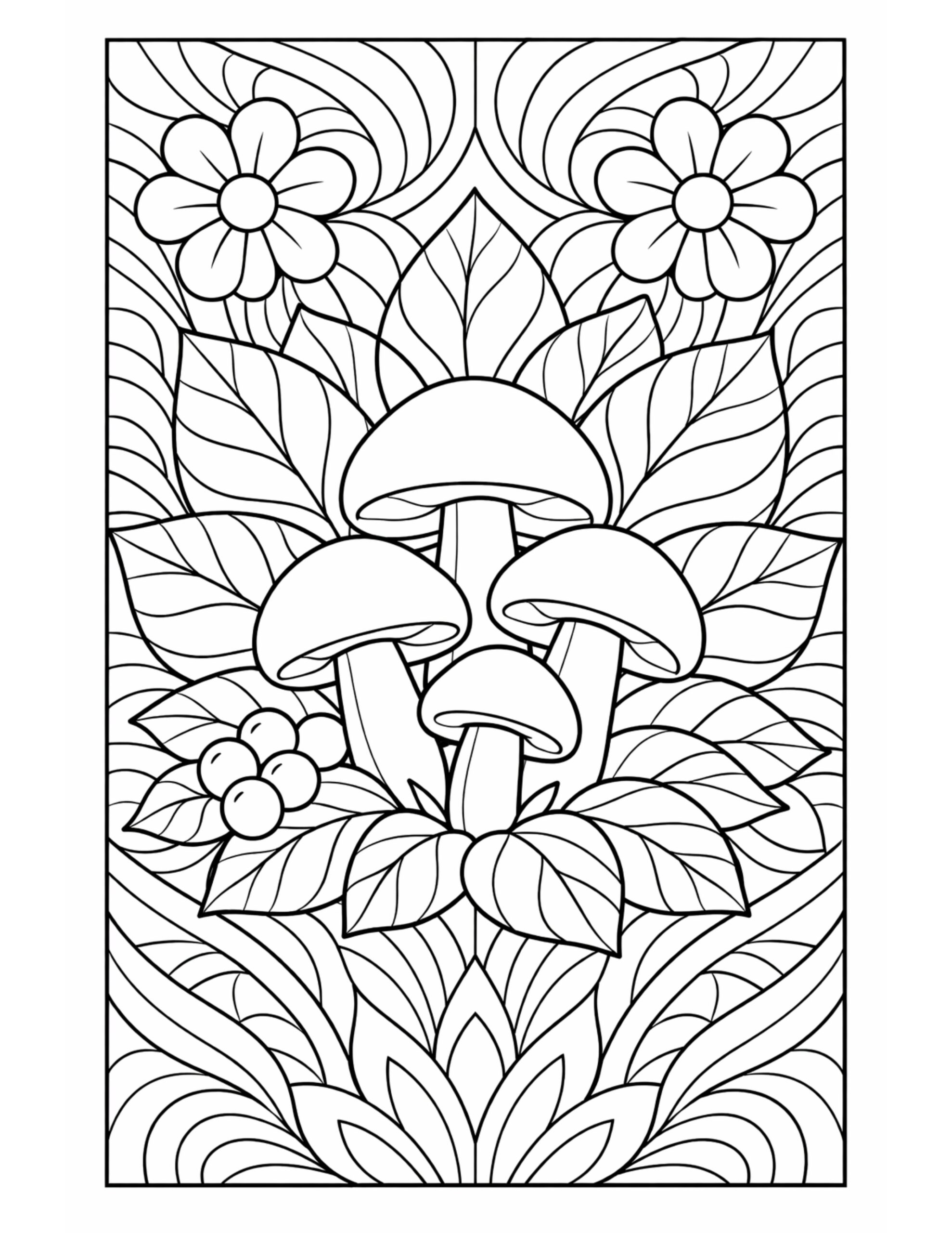 To begin with, earthy tones work beautifully for this illustration. Soft browns, warm beiges, and muted reds can bring the mushrooms to life. Meanwhile, different shades of green help separate each leaf layer clearly. You might also try gentle gradients to add depth without overpowering the clean line art. Additionally, using colored pencils allows for subtle shading along the leaf veins and mushroom caps. For contrast, small pops of brighter color on the flowers can guide the eye through the scene naturally.