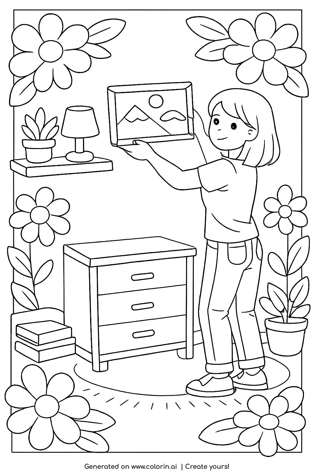 For this page, we entered the concept: a girl decorating her bedroom by hanging a framed picture on the wall, with simple furniture, plants, and large decorative flowers surrounding the scene on Colorin AI and generated a print ready coloring page in seconds. Then we added cheerful and cozy details to make the scene feel more alive, all in just a few minutes. You can follow the same process to create your own coloring pages, or build full coloring books without any design skills. For more creative inspiration, explore our ideas on Pinterest. This process also helped ensure the girl decorating her room coloring page remained clean, balanced, and enjoyable to color.