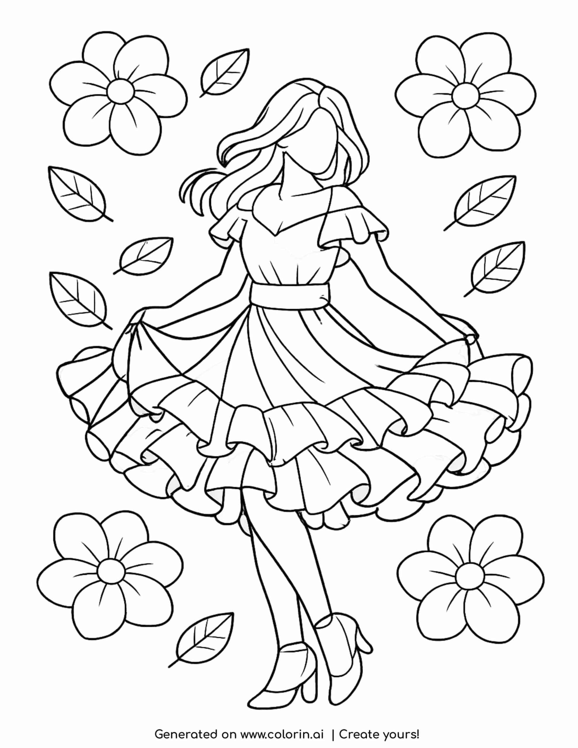 The girl in flowing dress coloring page shows a graceful figure twirling in a layered dress full of movement. Her skirt spreads outward in soft waves, while flowers and leaves float around her, creating a light and dreamy atmosphere. This design captures elegance and motion in a simple, relaxing scene.