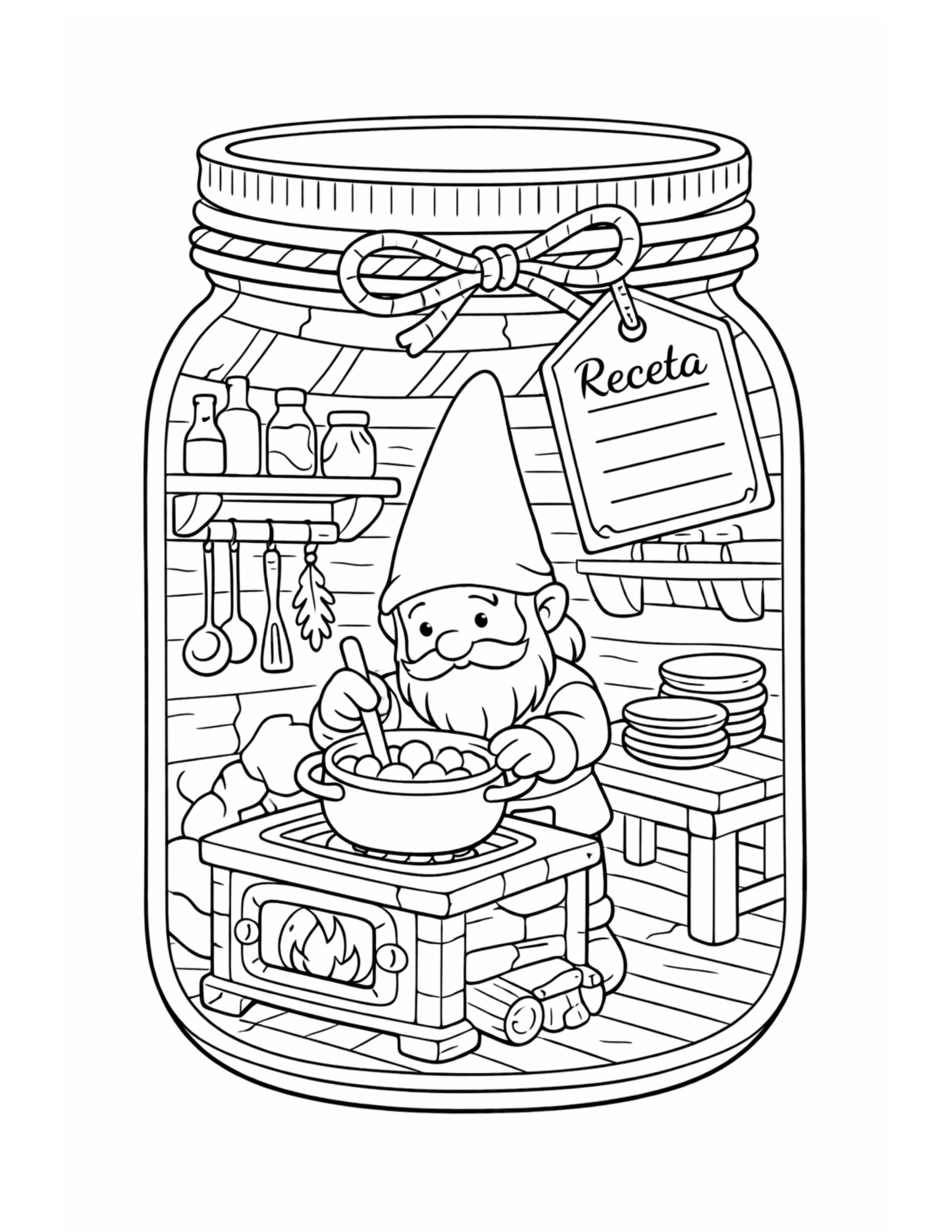 For this page, we entered the concept: “gnome cooking soup in jar coloring page” on Colorin AI and generated a print ready coloring page in seconds.