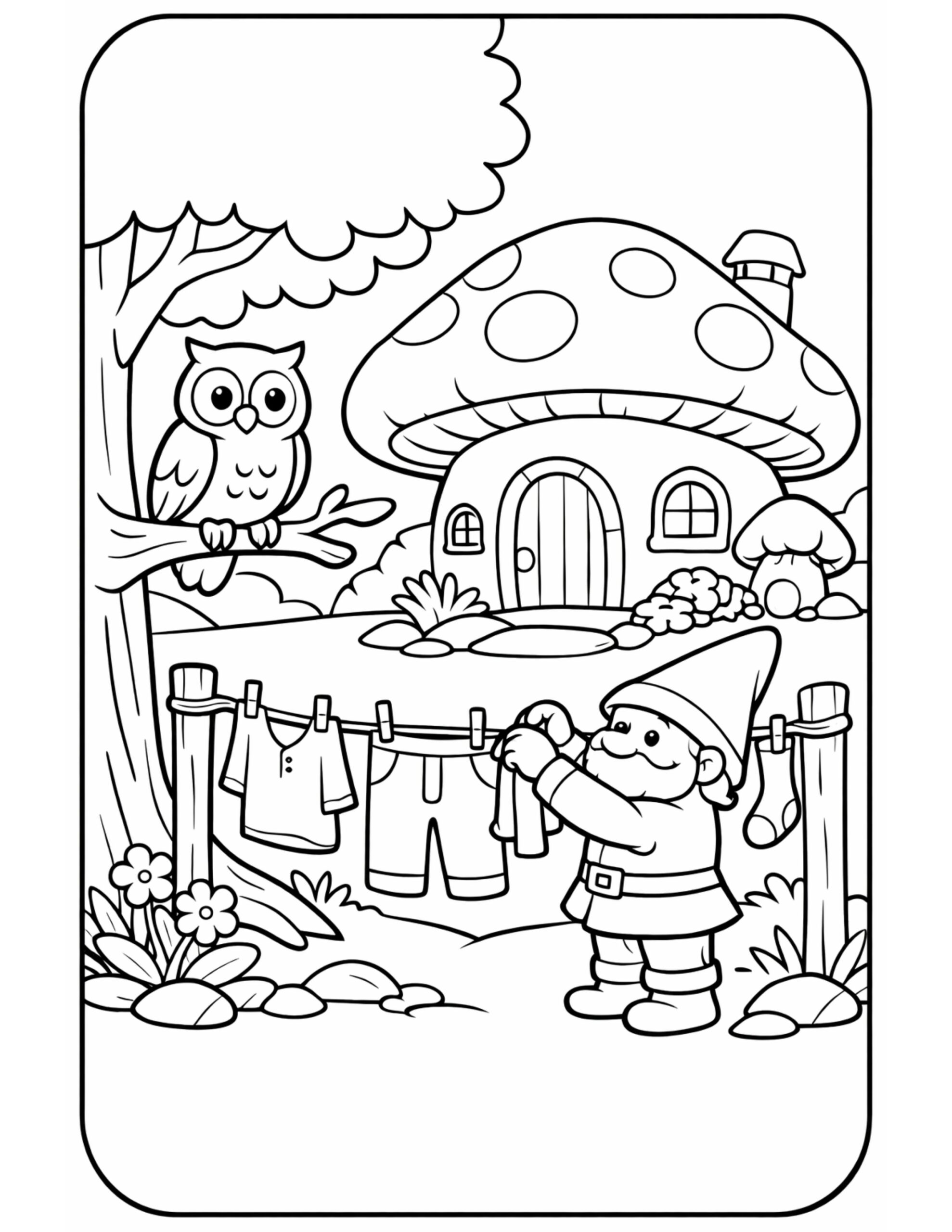 For this page, we entered the concept: “gnome hanging laundry outside coloring page, a smiling gnome pinning clothes on a clothesline near a mushroom house with an owl perched in a tree” on Colorin AI and generated a print ready coloring page in seconds.