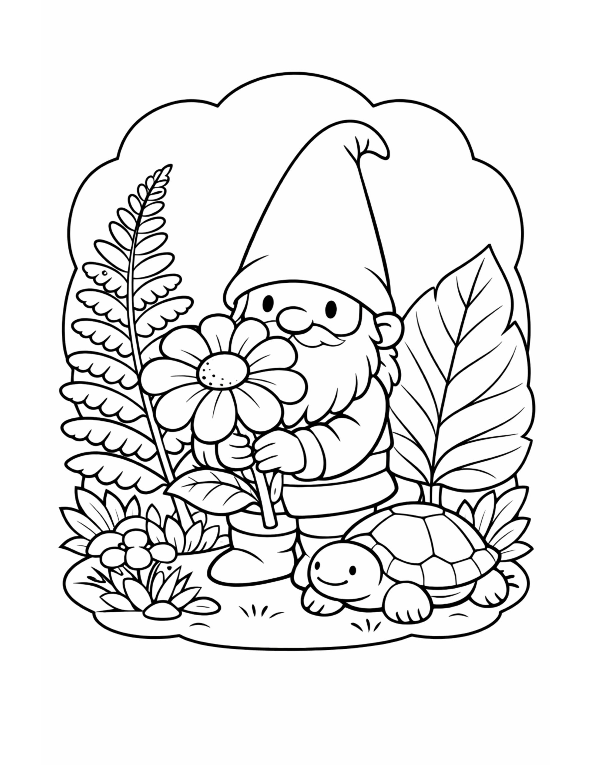 For this page, we entered the concept: “gnome holding flower with turtle coloring page + a smiling gnome holding a large flower beside a friendly turtle surrounded by simple garden leaves” on Colorin AI (enlazar “Colorin AI” a la pagina web https://www.colorin.ai/ y en negritas) and generated a print ready coloring page in seconds.