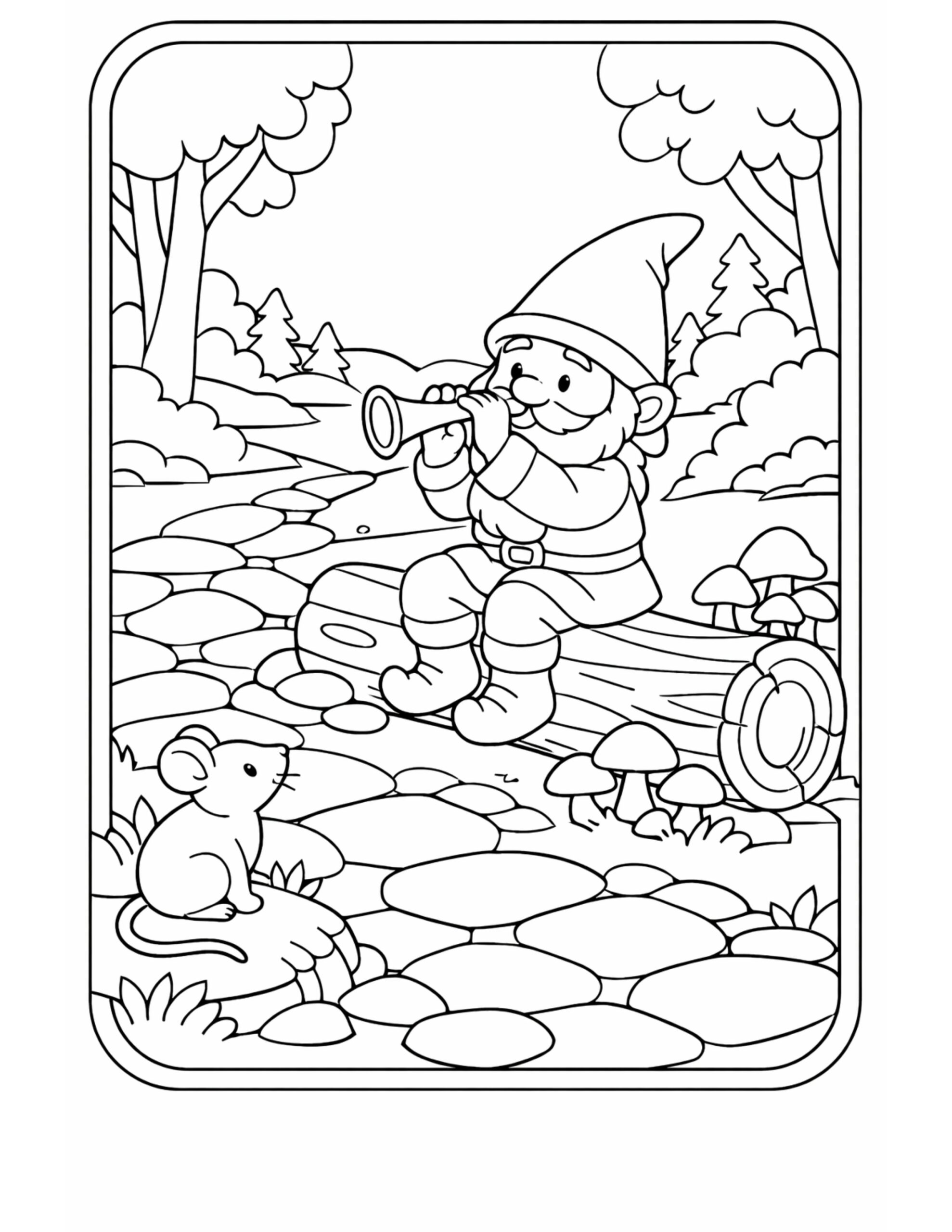 For this page, we entered the concept: “gnome looking through telescope coloring page, a cheerful gnome sitting on a log by a stone path with mushrooms and a small mouse” on Colorin AI and generated a print ready coloring page in seconds.
