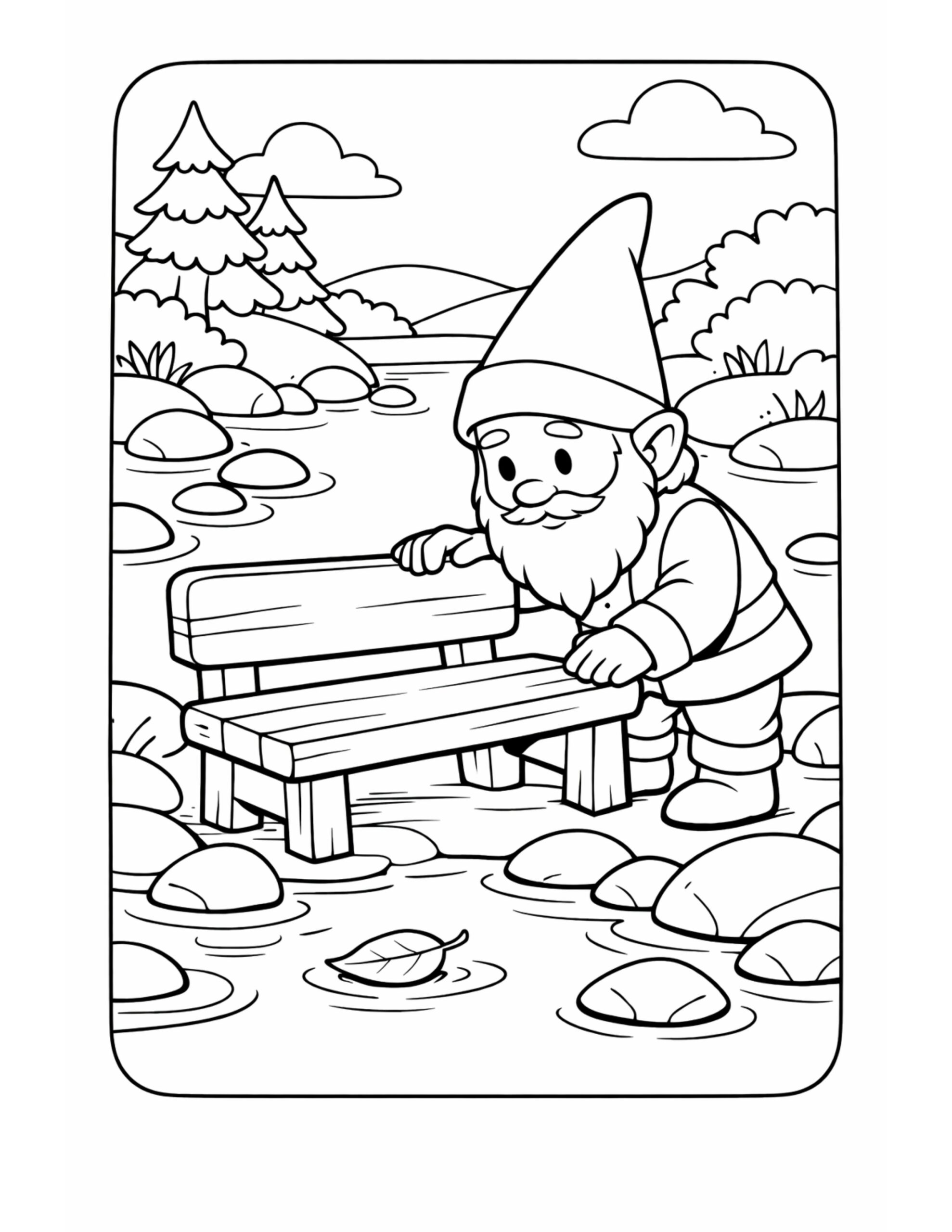 For this page, we entered the concept: “gnome placing bench in river coloring page and a friendly gnome adjusting a simple wooden bench among shallow water ripples, stones, and trees.” on Colorin AI (enlazar “Colorin AI” a la pagina web https://www.colorin.ai/ y en negritas) and generated a print ready coloring page in seconds.