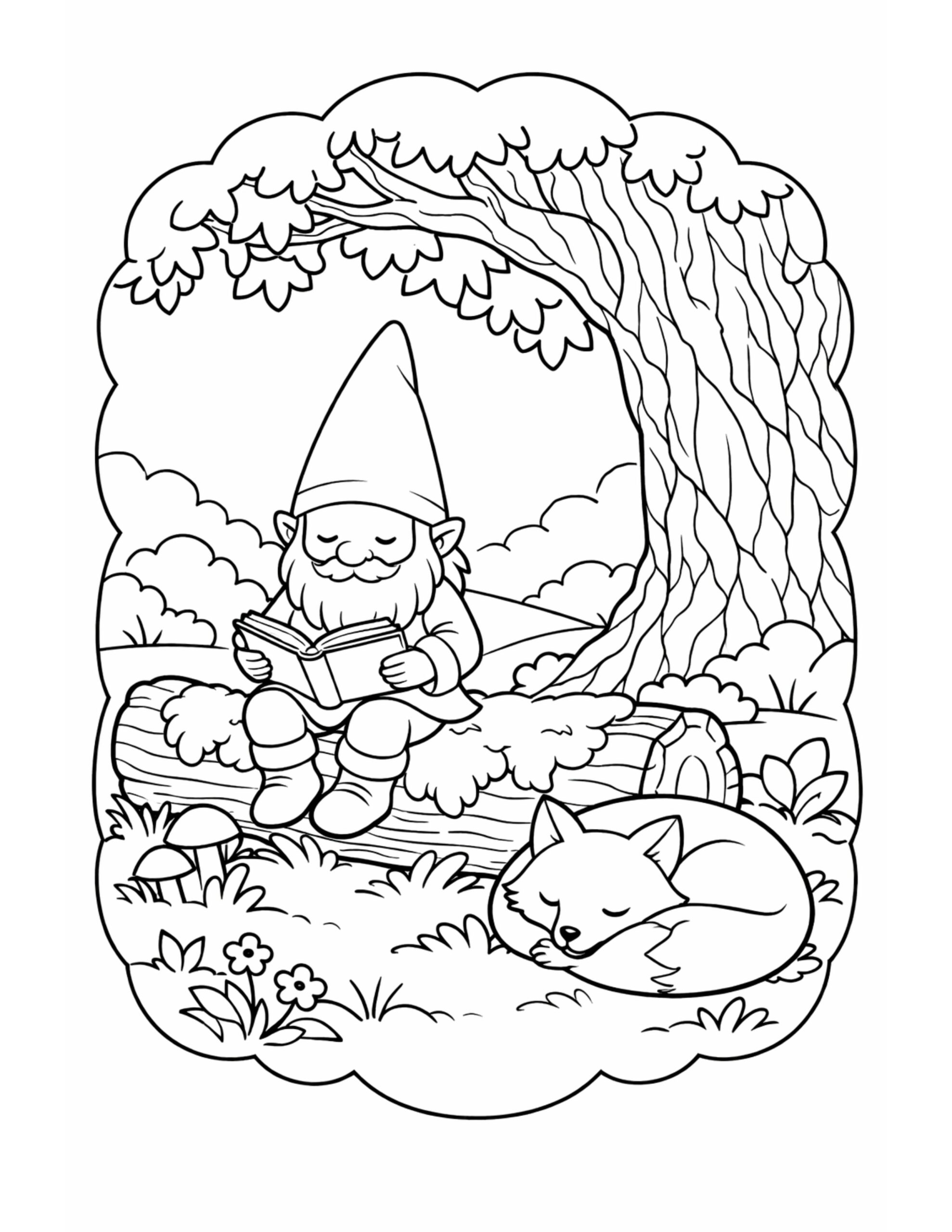 For this page, we entered the concept: “gnome reading on a log coloring page with a peaceful fox sleeping in the grass under a large tree.” on Colorin AI (enlazar “Colorin AI” a la pagina web https://www.colorin.ai/ y en negritas) and generated a print ready coloring page in seconds.