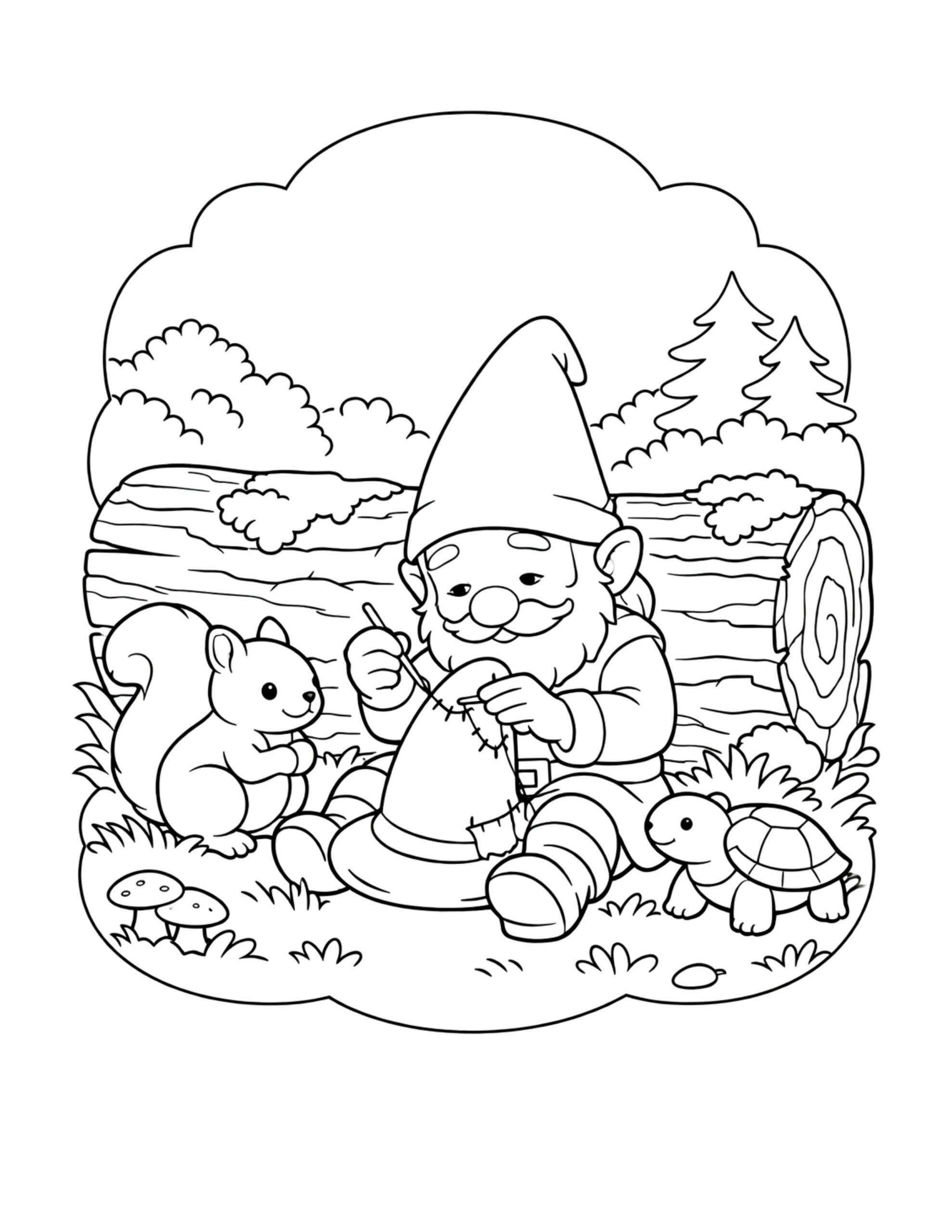 Additionally, coloring the gnome’s outfit and the woodland animals encourages creativity through simple choices and fun palettes. Meanwhile, staying inside the curved outlines helps fine motor control and pencil precision. Over time, this kind of gentle practice can feel both soothing and satisfying.