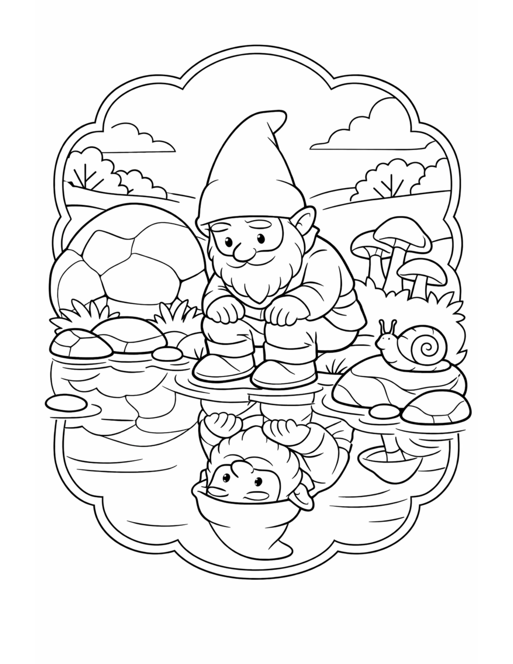 To begin, this gnome watching his reflection coloring page captures a quiet moment by the water’s edge. Nearby, a small snail rests on a rock while simple mushrooms stand in the grass. As a result, the clear reflection and smooth stones make it extra satisfying to color.