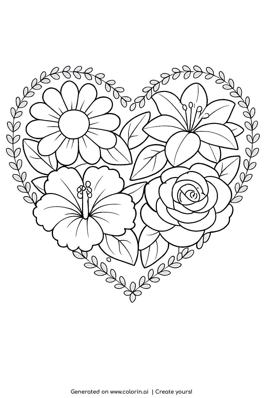 For this page, we entered the concept: a large heart fully filled with four big flowers and simple leaves, arranged evenly with clear spaces between them, and a decorative border made of small leaves following the outline of the heart on Colorin AI and generated a print ready coloring page in seconds. Then we added soft, floral and balanced details to make the scene feel more alive, all in just a few minutes. As a result, the heart filled with flowers coloring page feels clean, harmonious, and easy to color. You can follow the same process to create your own coloring pages, or build full coloring books without any design skills. For more creative inspiration, you can also explore our ideas on Pinterest.