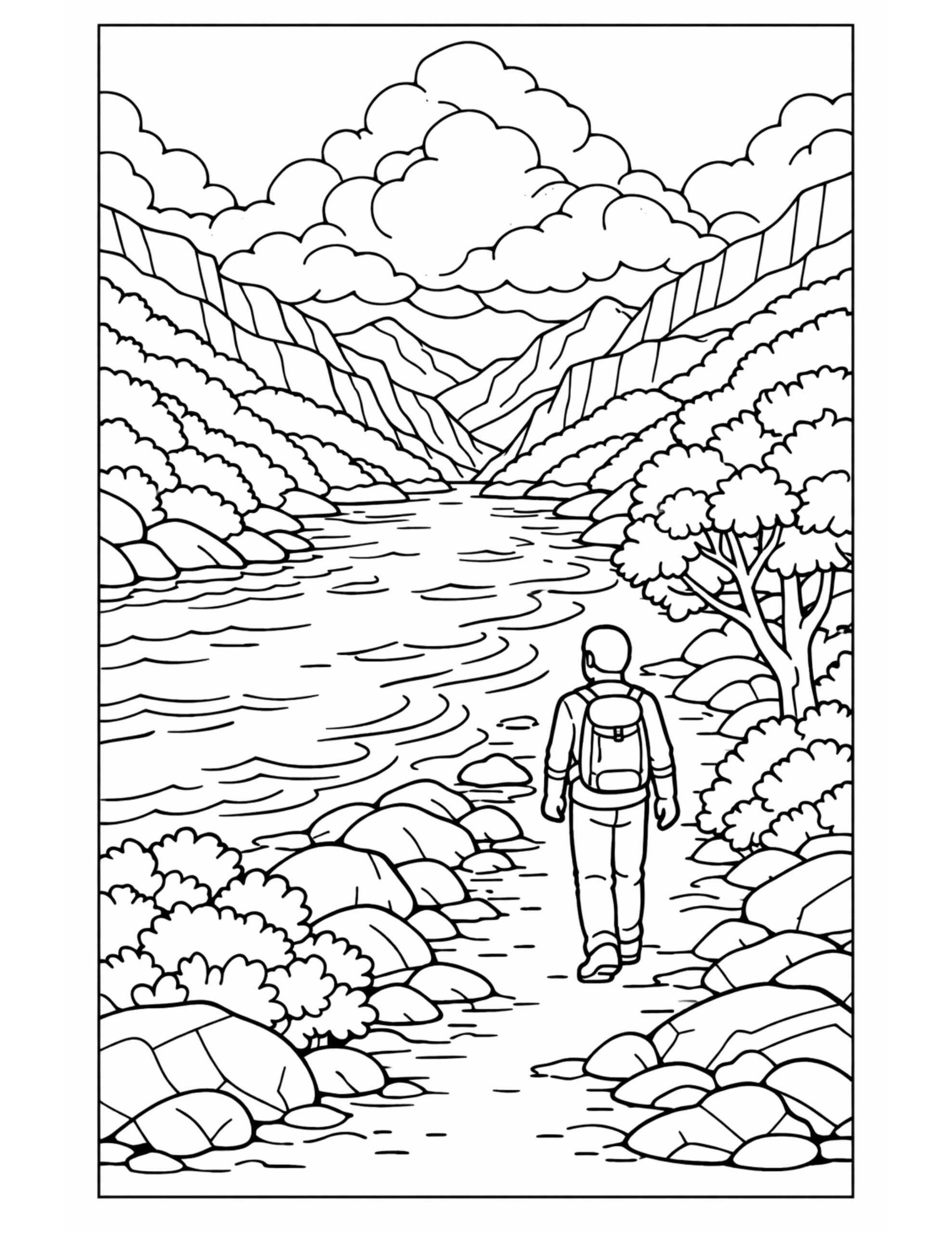 For this page, we entered the concept: “hiker walking beside mountain river coloring page” on Colorin AI and generated a print ready coloring page in seconds.