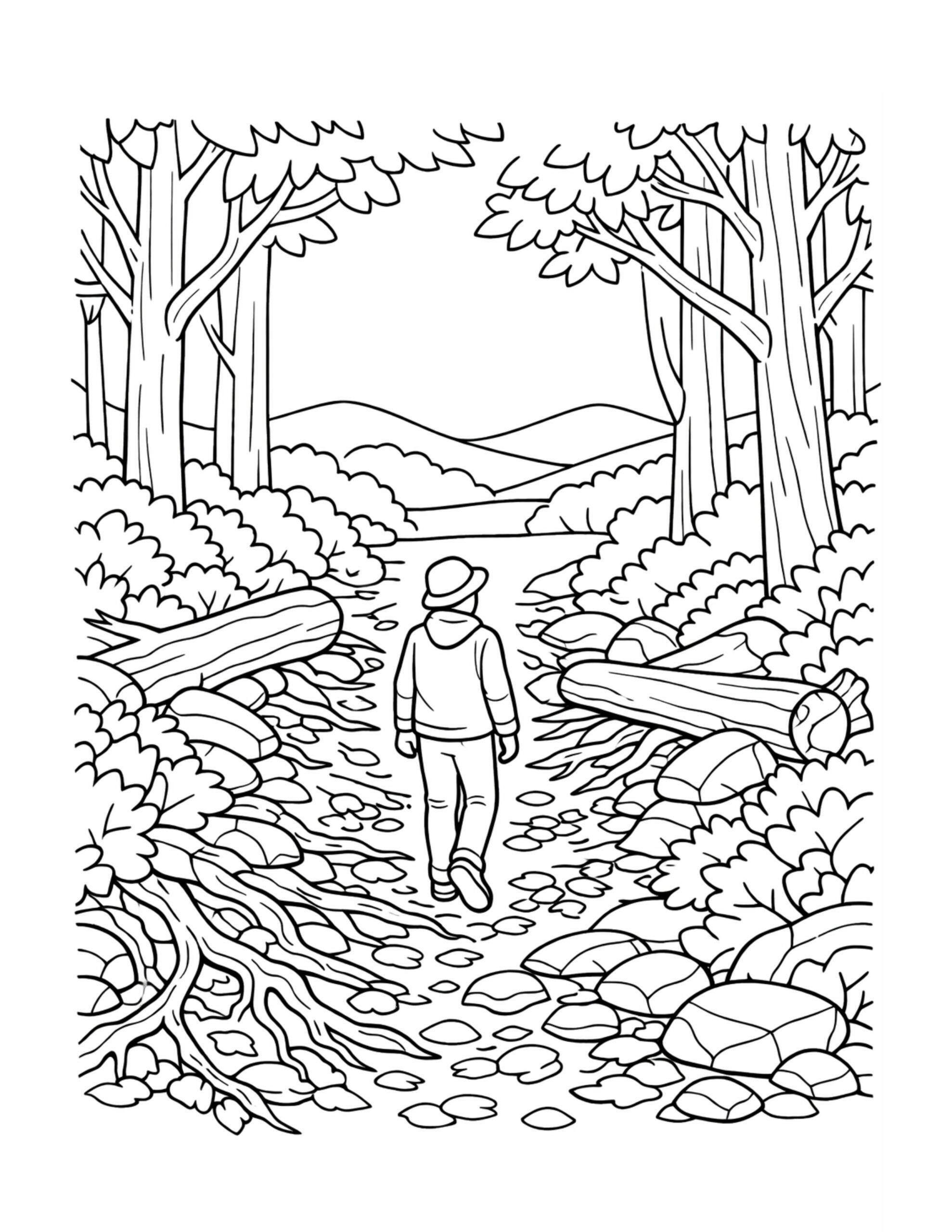 Hiker Walking Rocky Forest Path Scene Coloring Page