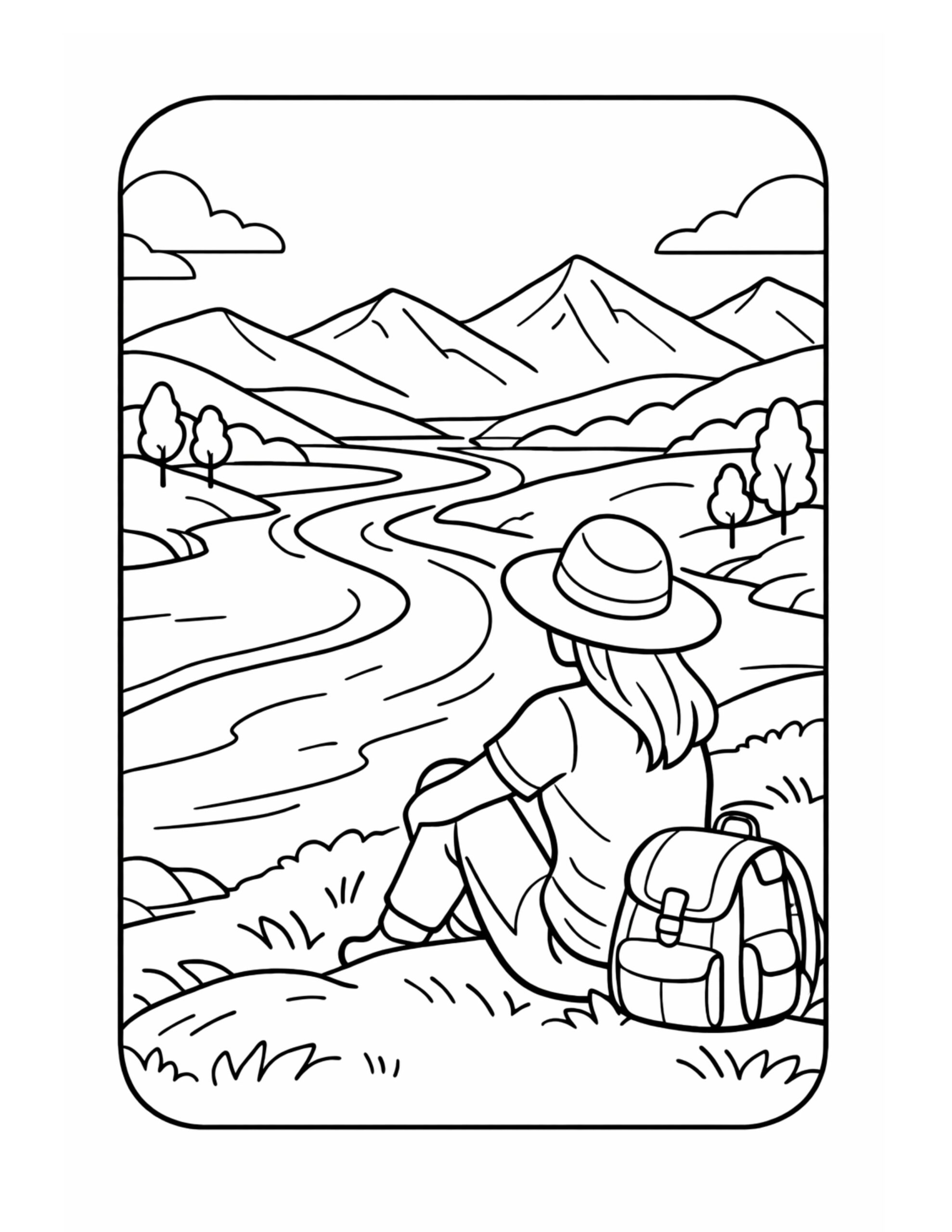 Additionally, this landscape helps concentration because the river and mountains create clear, calming shapes to fill. At the same time, the backpack straps and clothing folds give you smaller areas that encourage careful coloring. As a result, it feels engaging without being overwhelming.