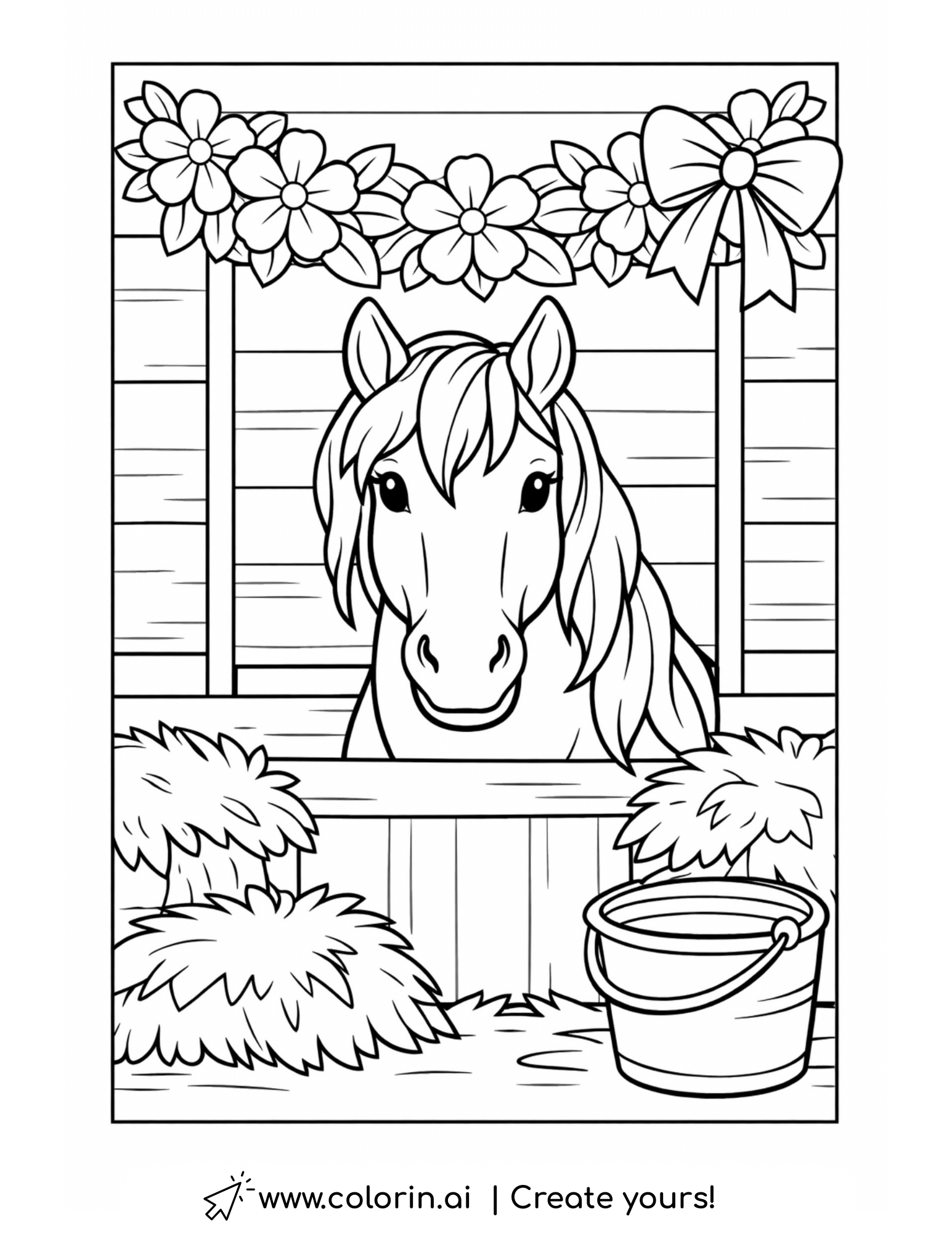 For this page, we entered the concept: horse in stable with flowers coloring page on Colorin AI and generated a print ready coloring page in seconds.