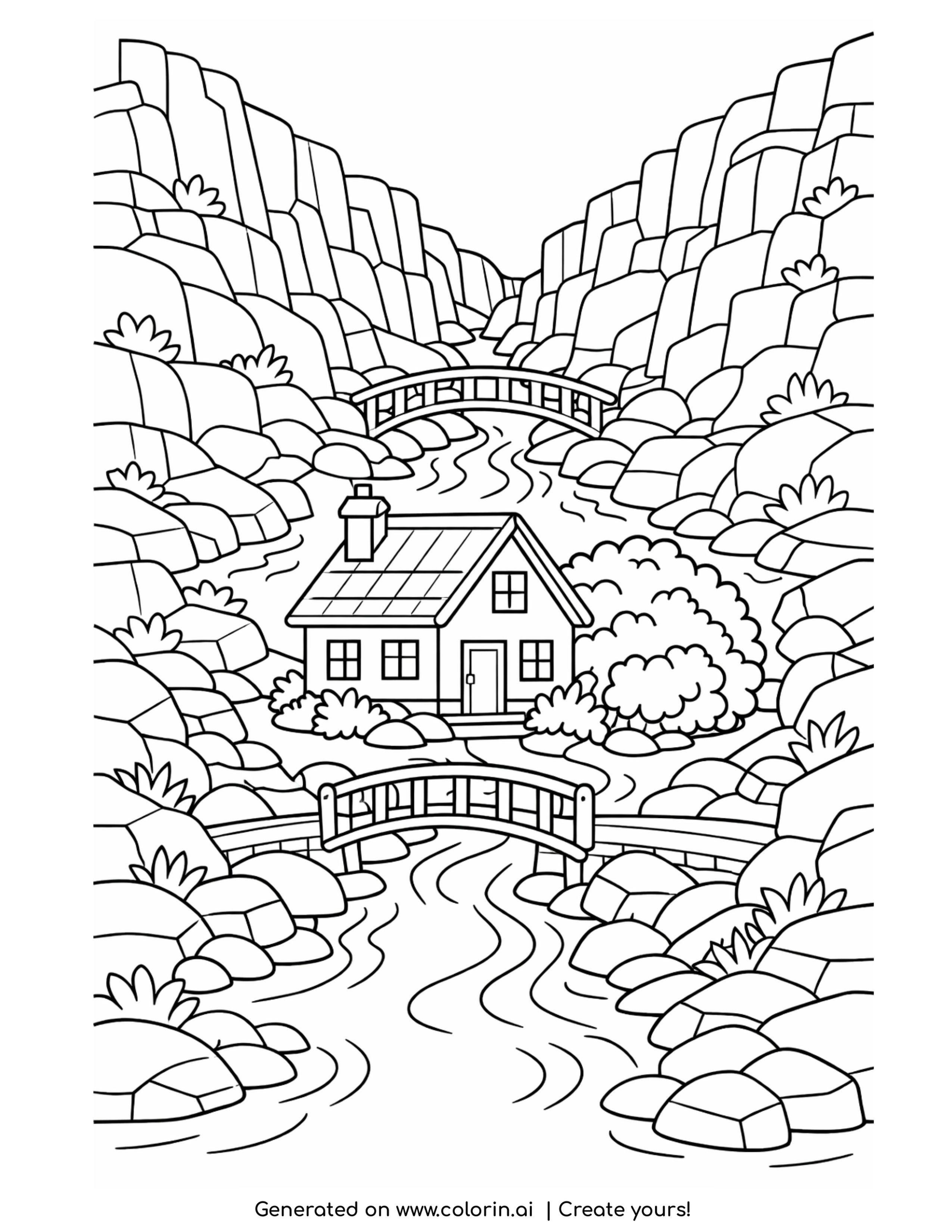 The house in rocky canyon with river coloring page shows a peaceful home surrounded by tall cliffs and a flowing river crossing the scene. This detailed landscape is perfect for creative coloring, offering many natural elements to bring to life.