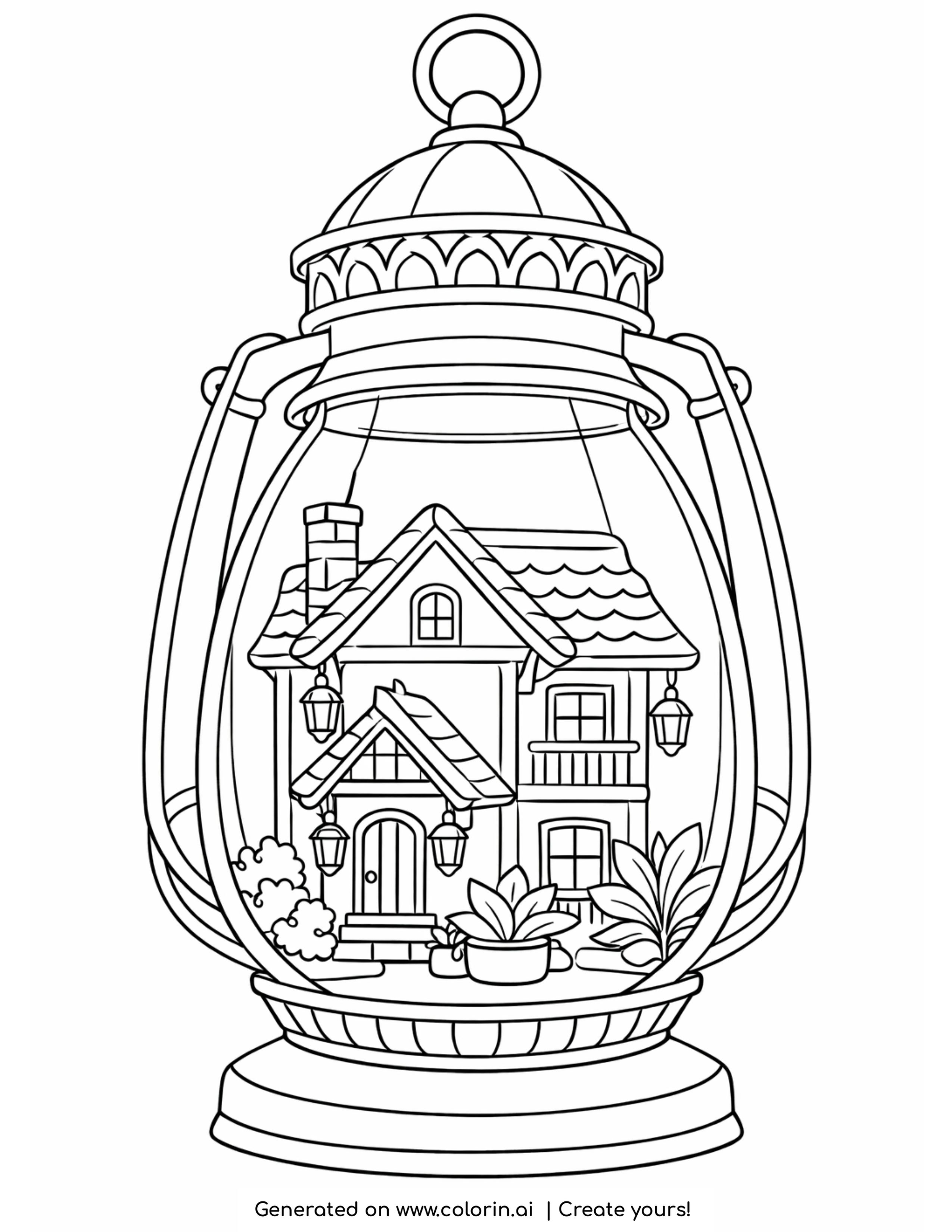 To begin with, use warm yellows and soft oranges inside the lantern to create a glowing effect. Meanwhile, the outer metal frame can be colored with grays or antique gold tones for a vintage look. The house itself works beautifully with soft browns and neutral shades.