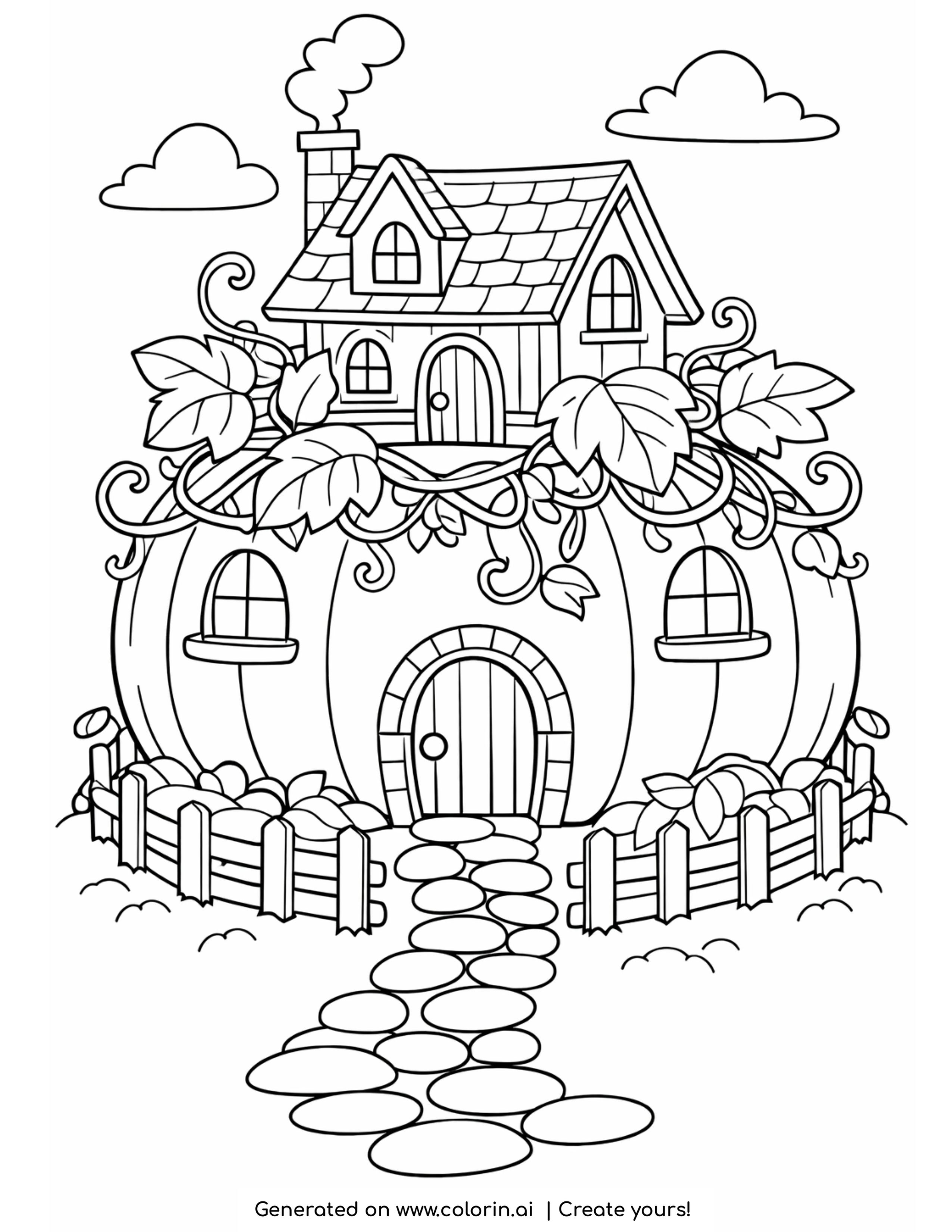 For this page, we entered the concept: house on pumpkin with vines coloring page on Colorin AI and generated a print ready coloring page in seconds.