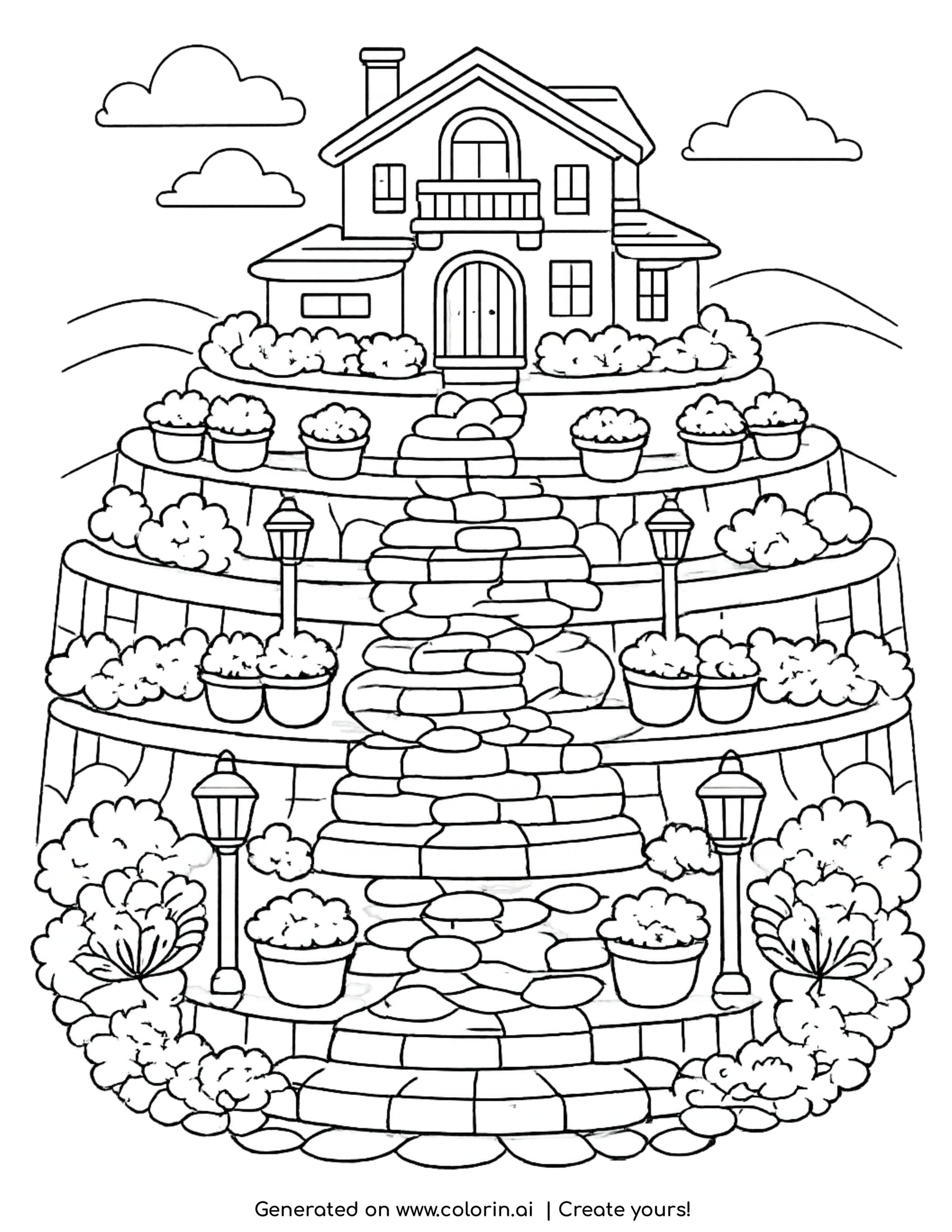For this page, we entered the concept: house on terraced hill stairs coloring page on Colorin AI and generated a print ready coloring page in seconds. Then we added structured garden details to make the scene feel more alive, all in just a few minutes. You can follow the same process to create your own coloring pages, or build full coloring books without any design skills. For more creative inspiration, check out our Pinterest profile.