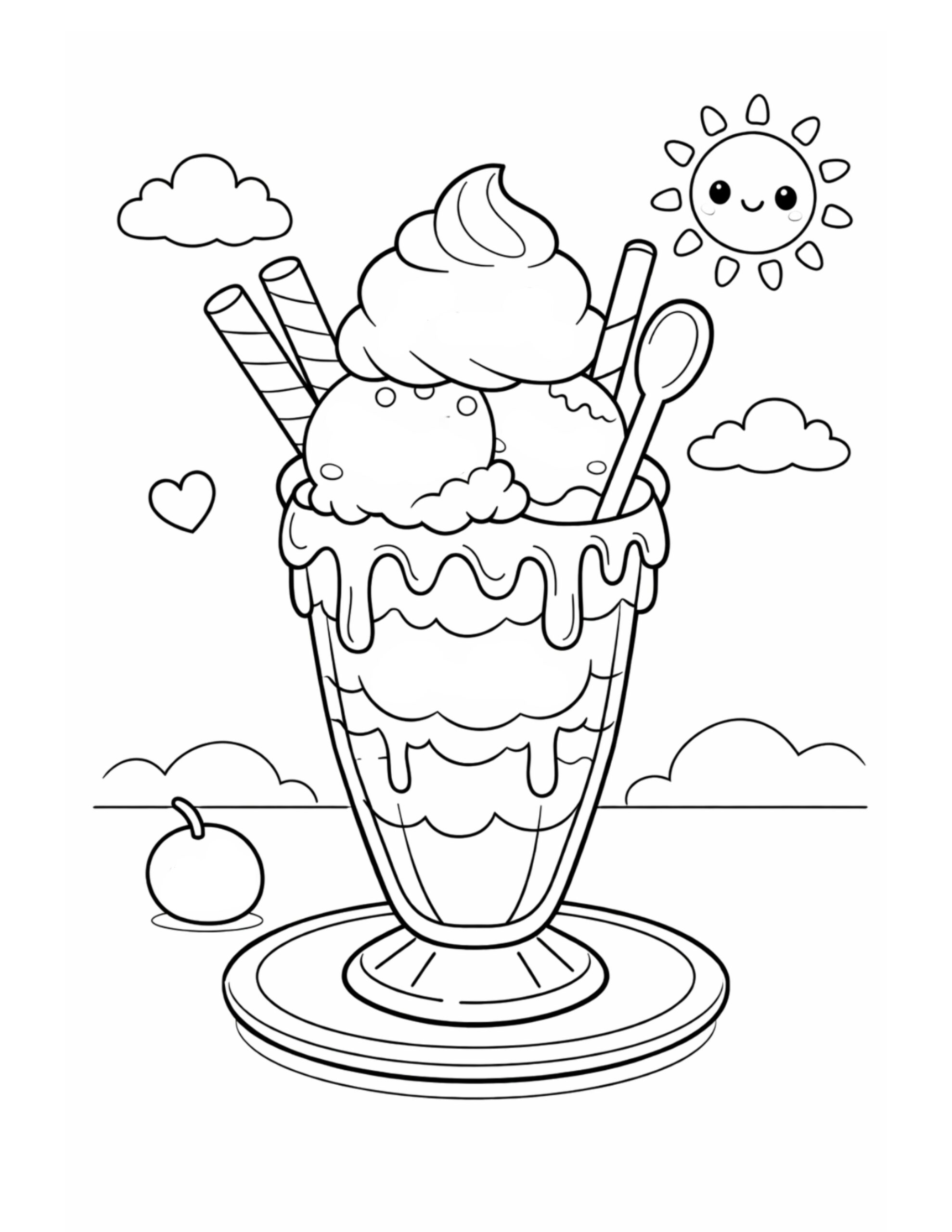 To start, soft pastel colors work well for the ice cream scoops, helping each layer feel light and creamy. You can also use brighter tones for syrup drips to create contrast and visual interest. Additionally, warm yellows and gentle blues are great choices for the sunny sky and clouds. Light shading along the glass edges can add depth while keeping the illustration airy.