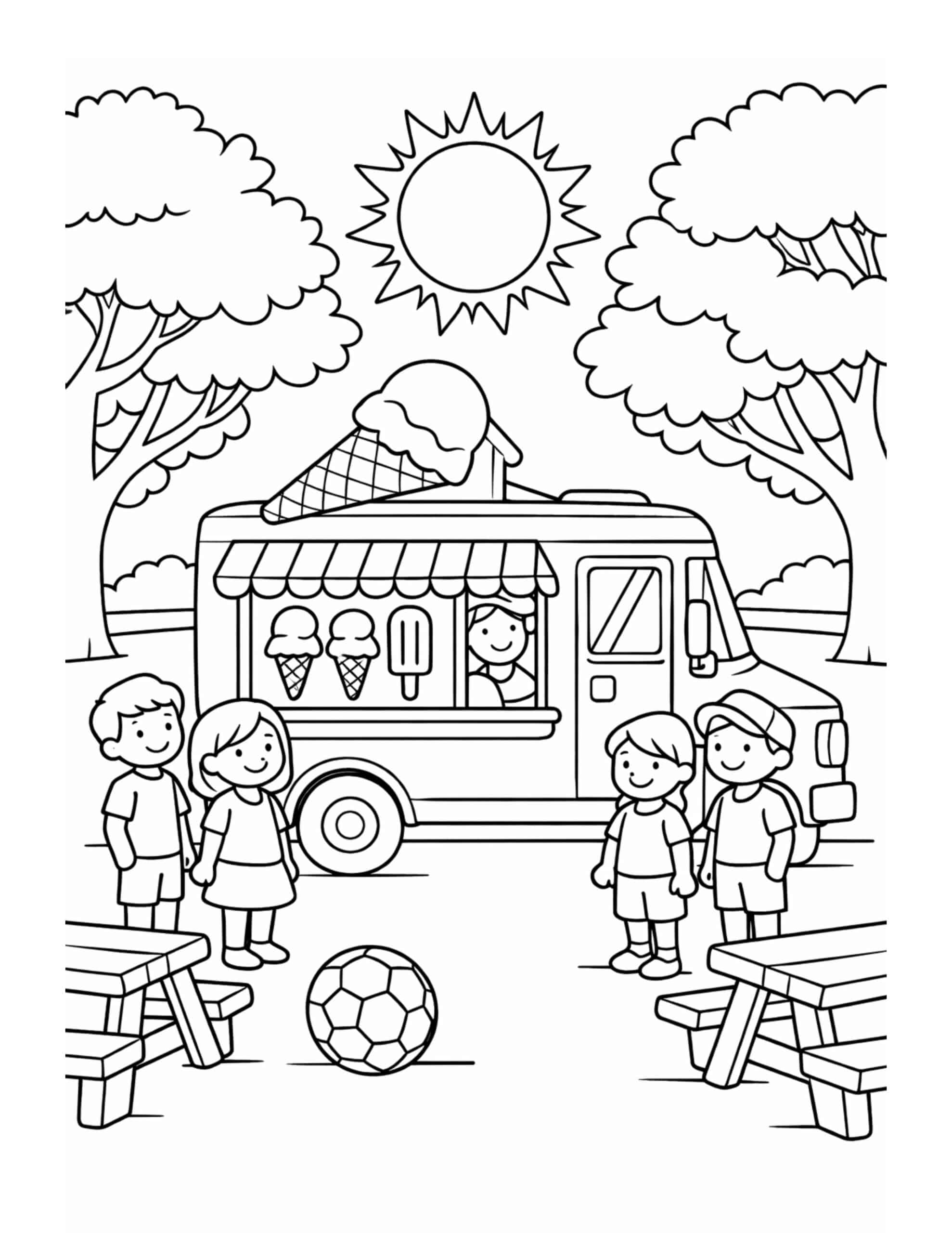To begin, try soft pastels or bright primary colors for the ice cream truck to give it a fun, inviting look. Meanwhile, light blues and yellows work well for the sky and sun, helping the scene feel warm. You can also use different greens for the trees and grass to add depth. Additionally, adding small color accents to the ice cream signs makes the truck stand out even more.