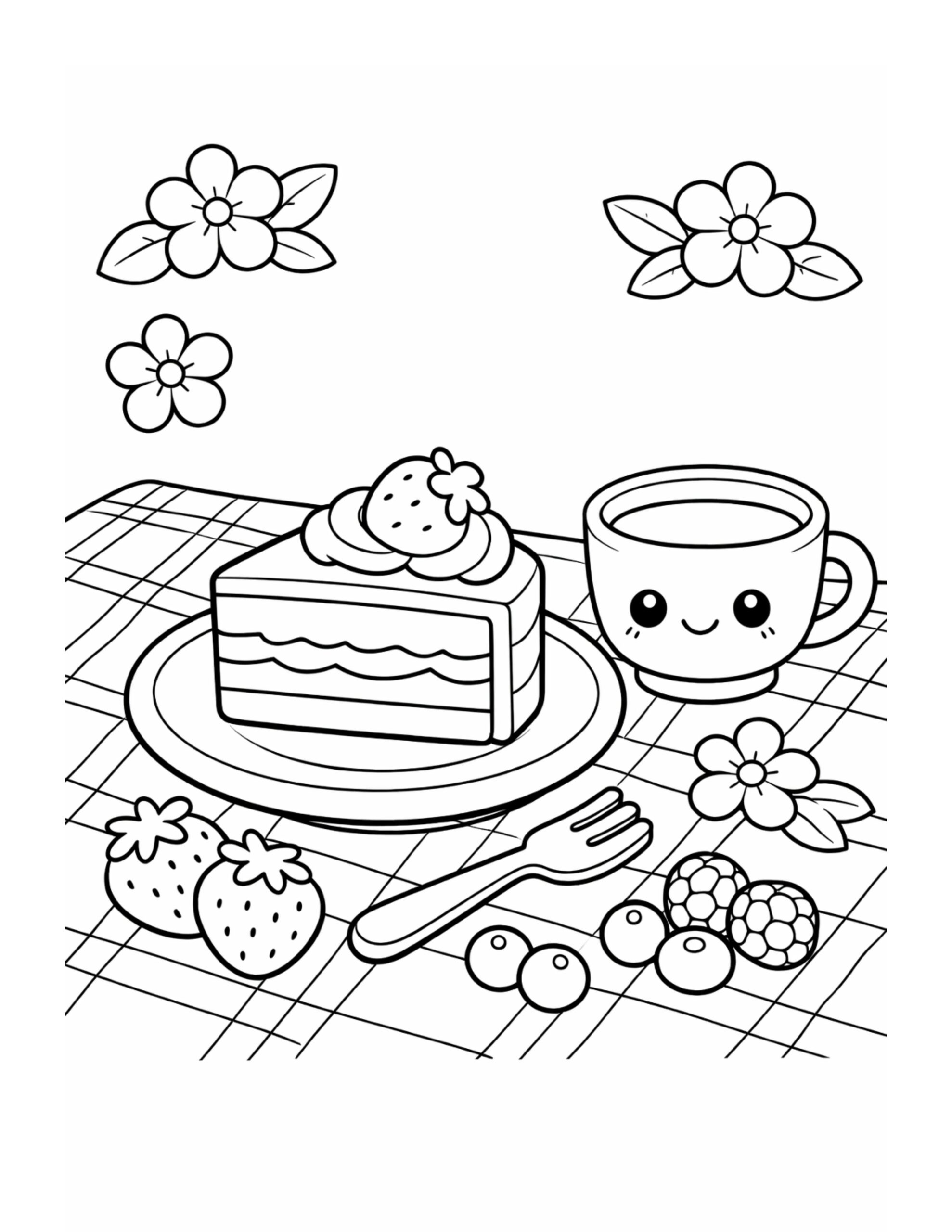 Because the scene mixes big shapes with small details, it supports focus without feeling overwhelming. At the same time, coloring the berry circles, plate edges, and fork lines helps strengthen fine motor control. Moreover, planning a balanced palette for cake, drink, and fruit boosts creativity in a simple way. As you continue, the calm tea-time vibe can encourage relaxation, which makes this page a soothing break that still feels productive.