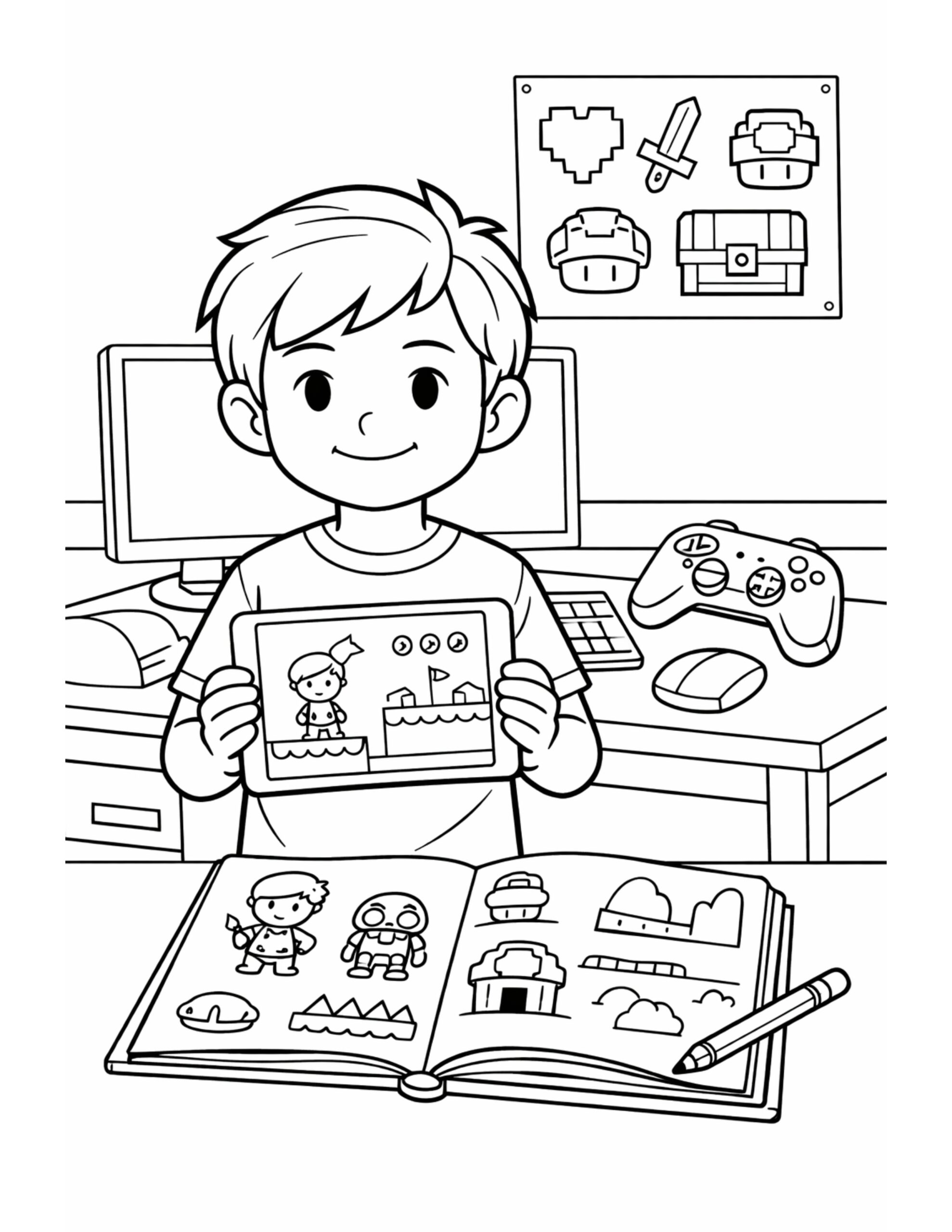 To begin with, this kid game designer showing tablet coloring page features a cheerful child holding a tablet with a simple platform game scene. Nearby, you can see a computer setup and a game controller on the desk, which instantly suggests a creative workspace. Overall, it’s fun to color because the lines are clean, the objects are familiar, and the scene feels modern and playful.