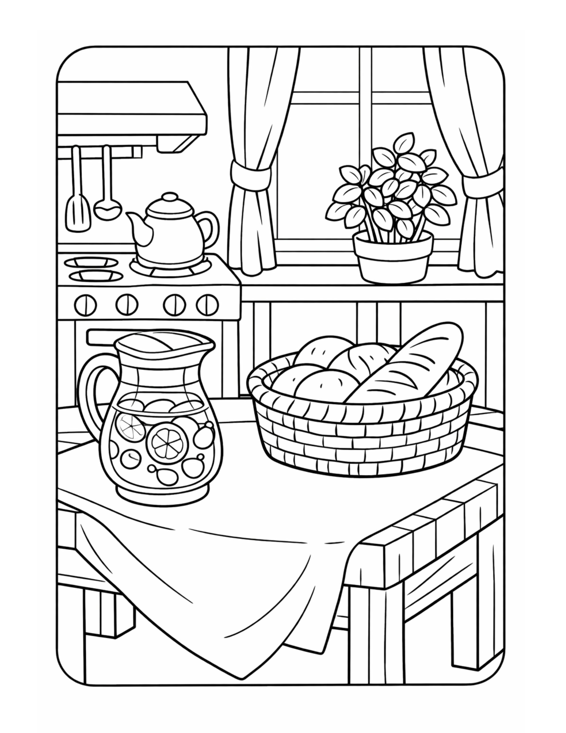 For this page, we entered the concept: “kitchen table with bread basket coloring page, with a citrus pitcher on a table and a kettle by the stove (coloring page)” on Colorin AI and generated a print ready coloring page in seconds.