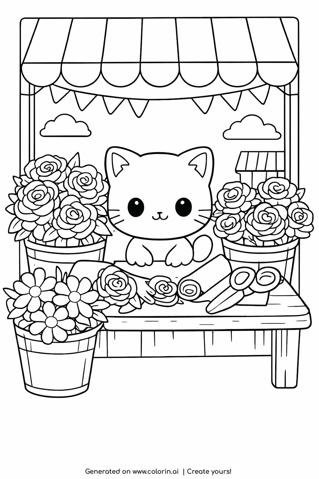 For this page, we entered the concept: kitten at outdoor flower market coloring page on Colorin AI and generated a print ready coloring page in seconds.
