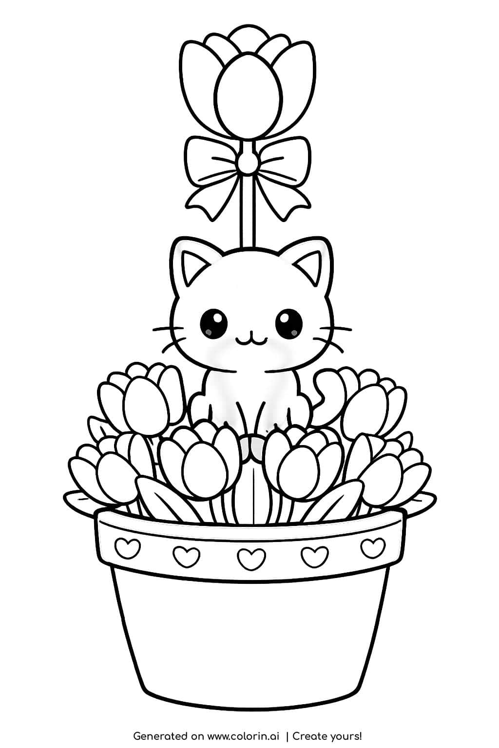 For this page, we entered the concept: kitten sitting in tulip flower pot coloring page on Colorin AI and generated a print ready coloring page in seconds.
