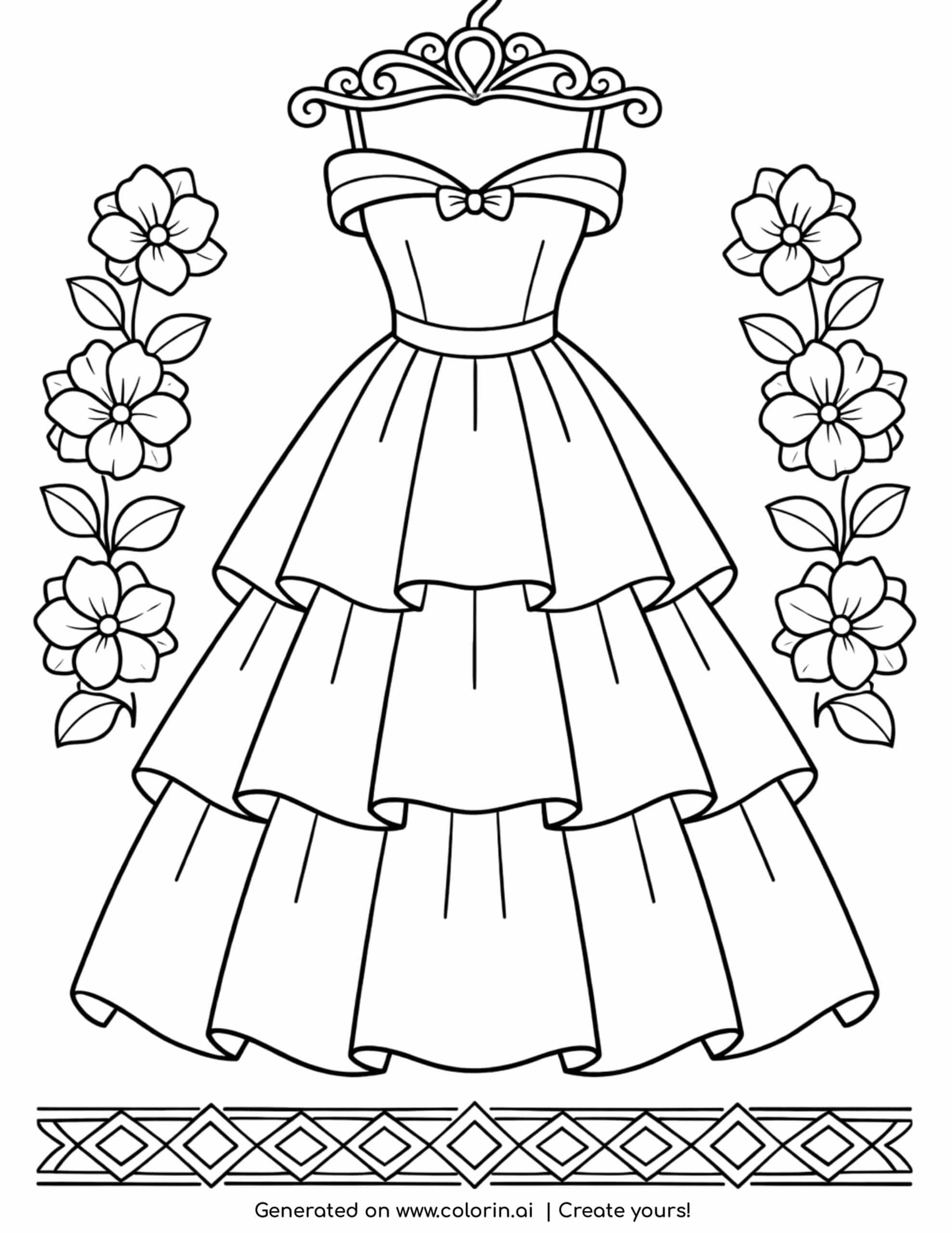 The layered gown with flowers coloring page features an elegant dress with multiple flowing layers and a decorative bodice, framed by delicate flowers on both sides. The graceful design and symmetrical composition create a sophisticated and relaxing coloring experience.