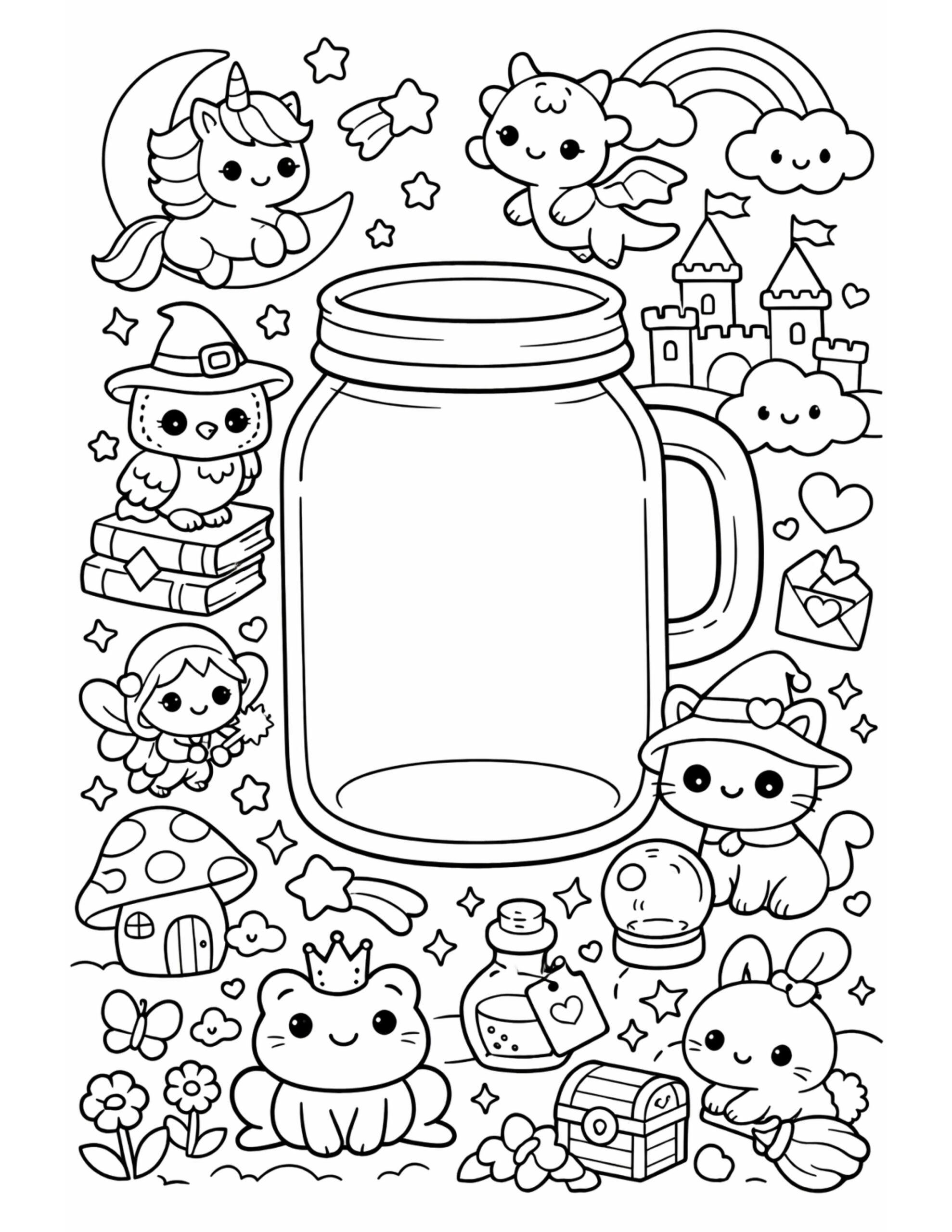 For this page, we entered the concept: “magical jar with kawaii creatures coloring page” on Colorin AI and generated a print ready coloring page in seconds.