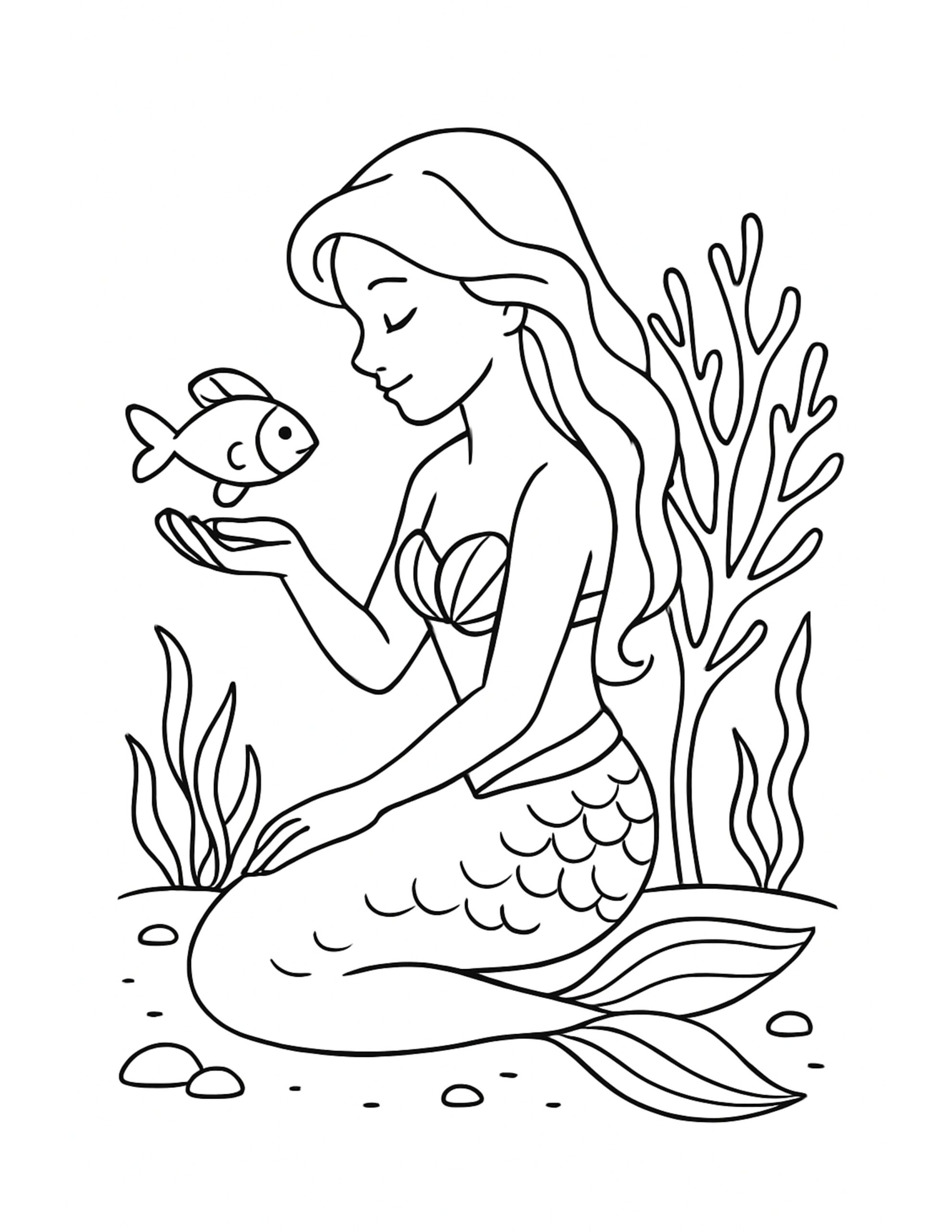 Because the drawing has clear outlines and open spaces, it supports fine motor control while still feeling easy to complete. At the same time, choosing colors for the tail, hair, and underwater plants encourages creativity and personal style. Additionally, the calm pose and simple sea setting can help with relaxation, especially when you focus on slow shading and steady strokes. Over time, finishing the scene also builds concentration and patience, since small details like scales and coral lines reward careful attention.
