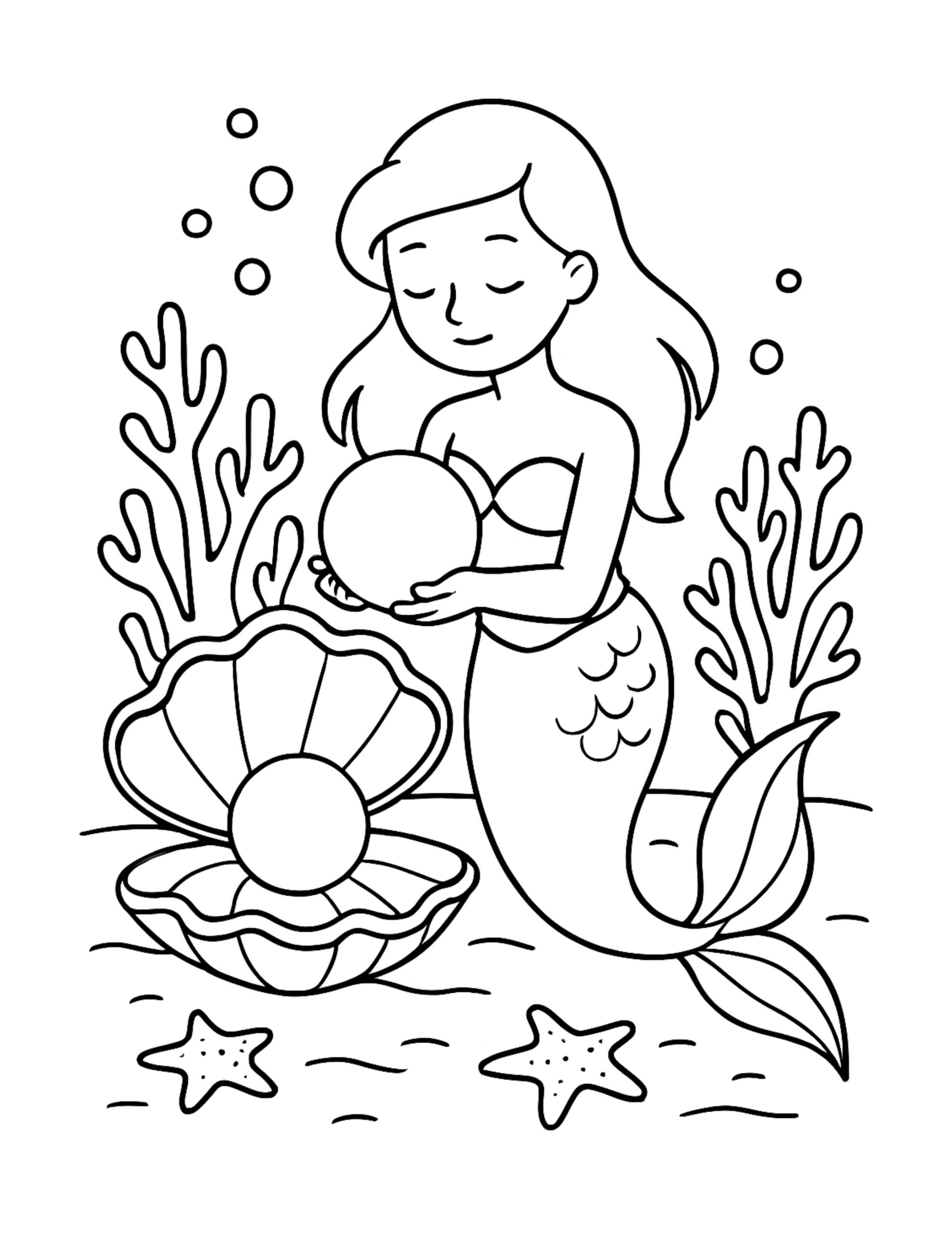For this page, we entered the concept: “mermaid holding pearl near clam coloring page” on Colorin AI and generated a print ready coloring page in seconds.