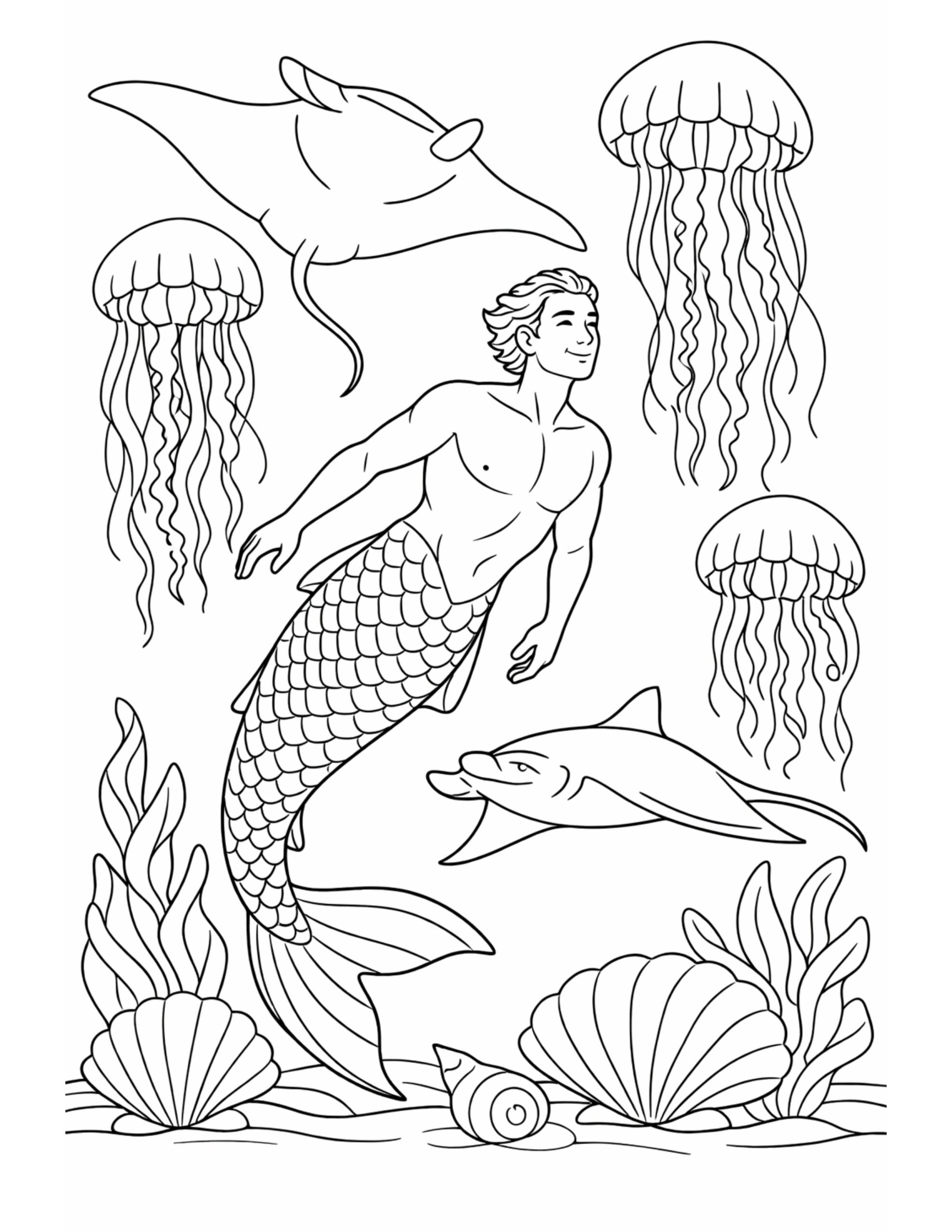 The merman swimming with dolphin coloring page shows a calm underwater scene where a friendly merman floats beside a playful dolphin. Nearby, soft jellyfish drift around them, while a manta ray glides above for an extra sense of wonder. Overall, the mix of open space and gentle details makes this page relaxing, imaginative, and fun to color.