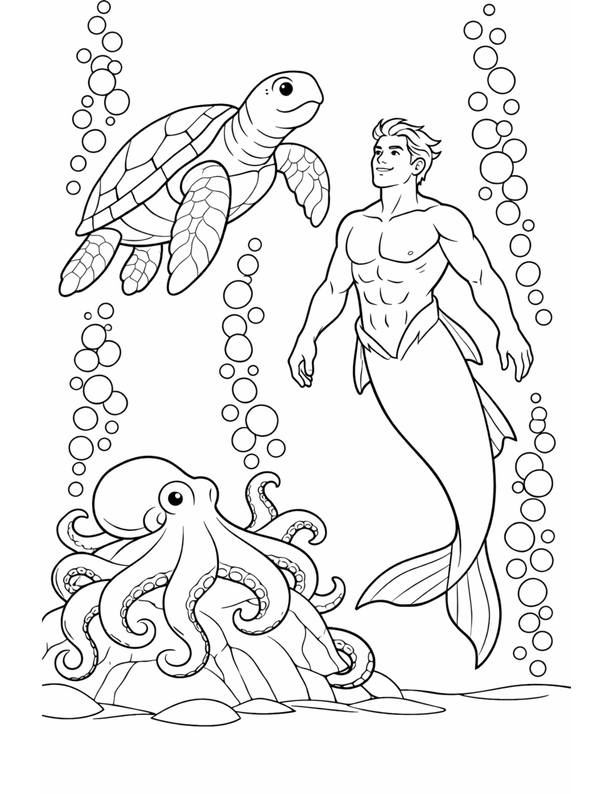 This merman swimming with sea turtle coloring page captures a calm underwater moment with a smiling merman drifting beside a gentle turtle. Meanwhile, a curious octopus rests on rocks below as bubbles rise all around the scene. Because the characters are clear and expressive, it feels playful to color and easy to personalize.