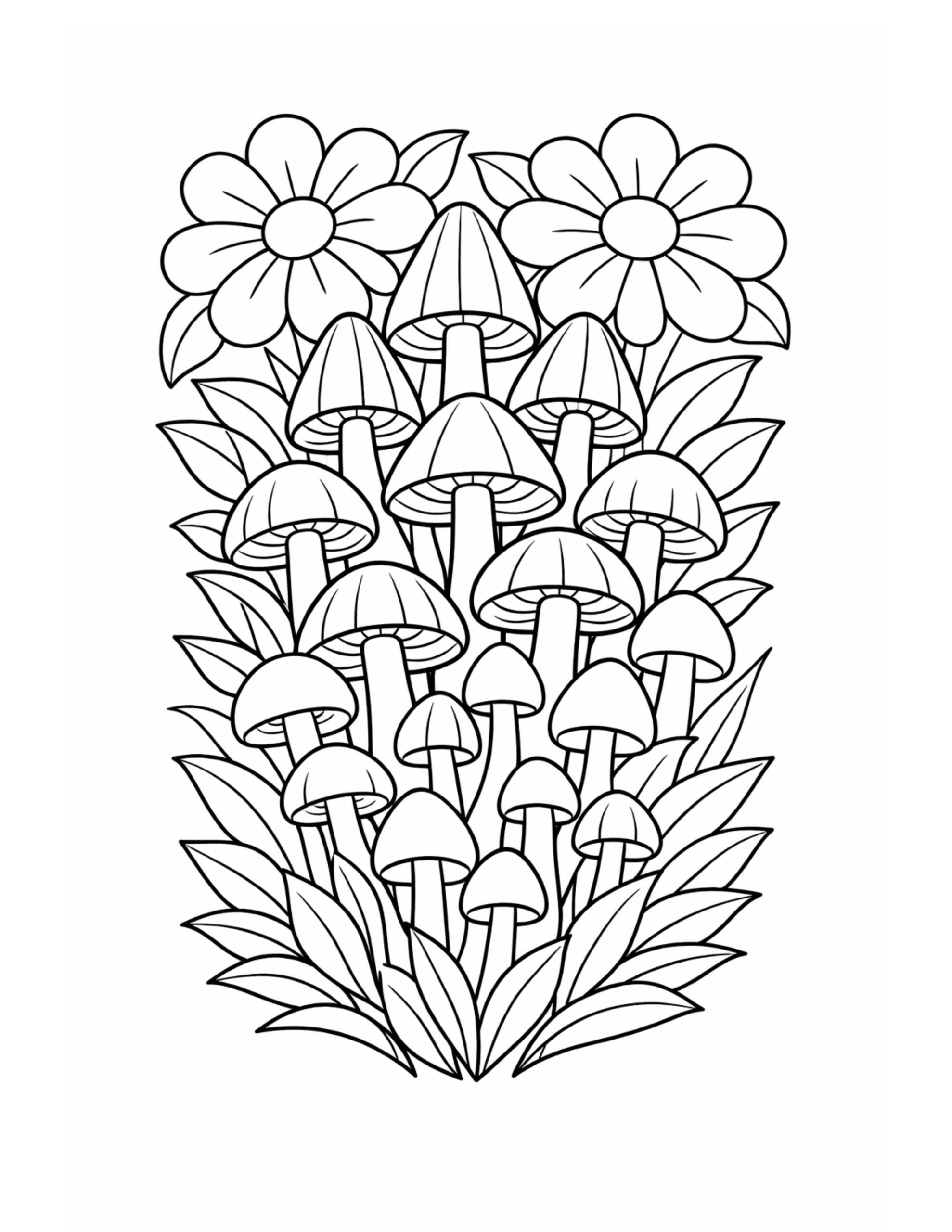 Mushroom Cluster With Daisies Coloring Page