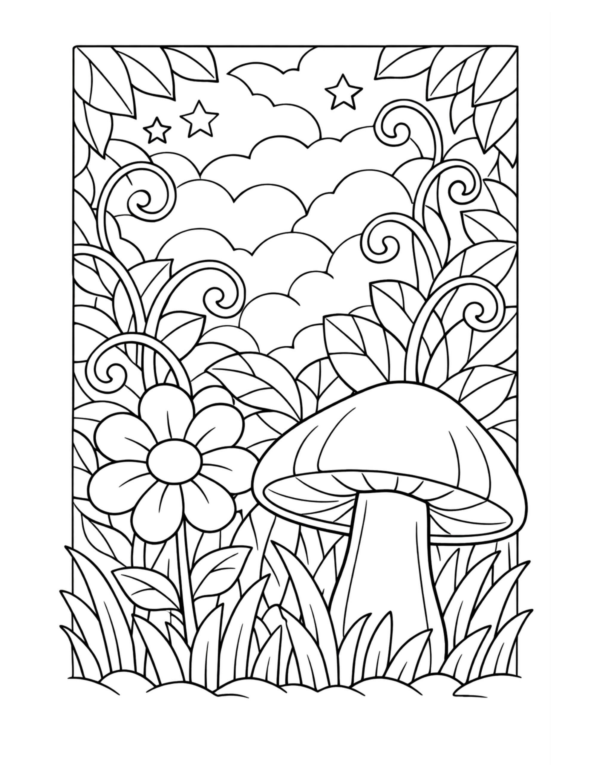 Mushroom in Starry Garden Coloring Page