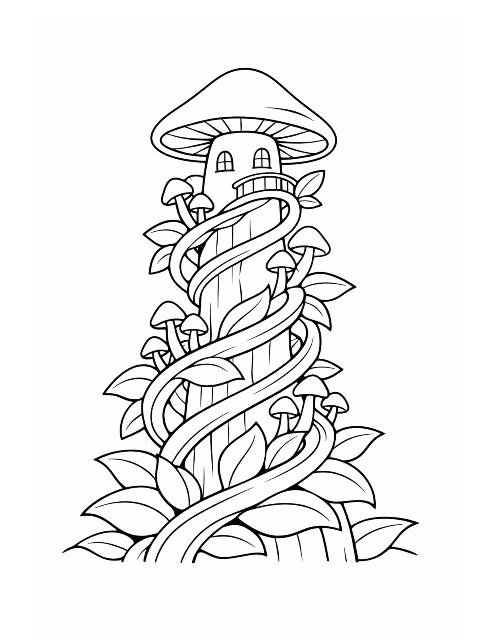 Because the vine twists in a long, continuous path, this page encourages steady focus as you follow each curve from bottom to top. At the same time, coloring the narrow vine edges and small mushrooms supports fine motor control and careful hand movement. Also, balancing colors between the cap, stem, and leaves builds planning skills in a simple, visual way.