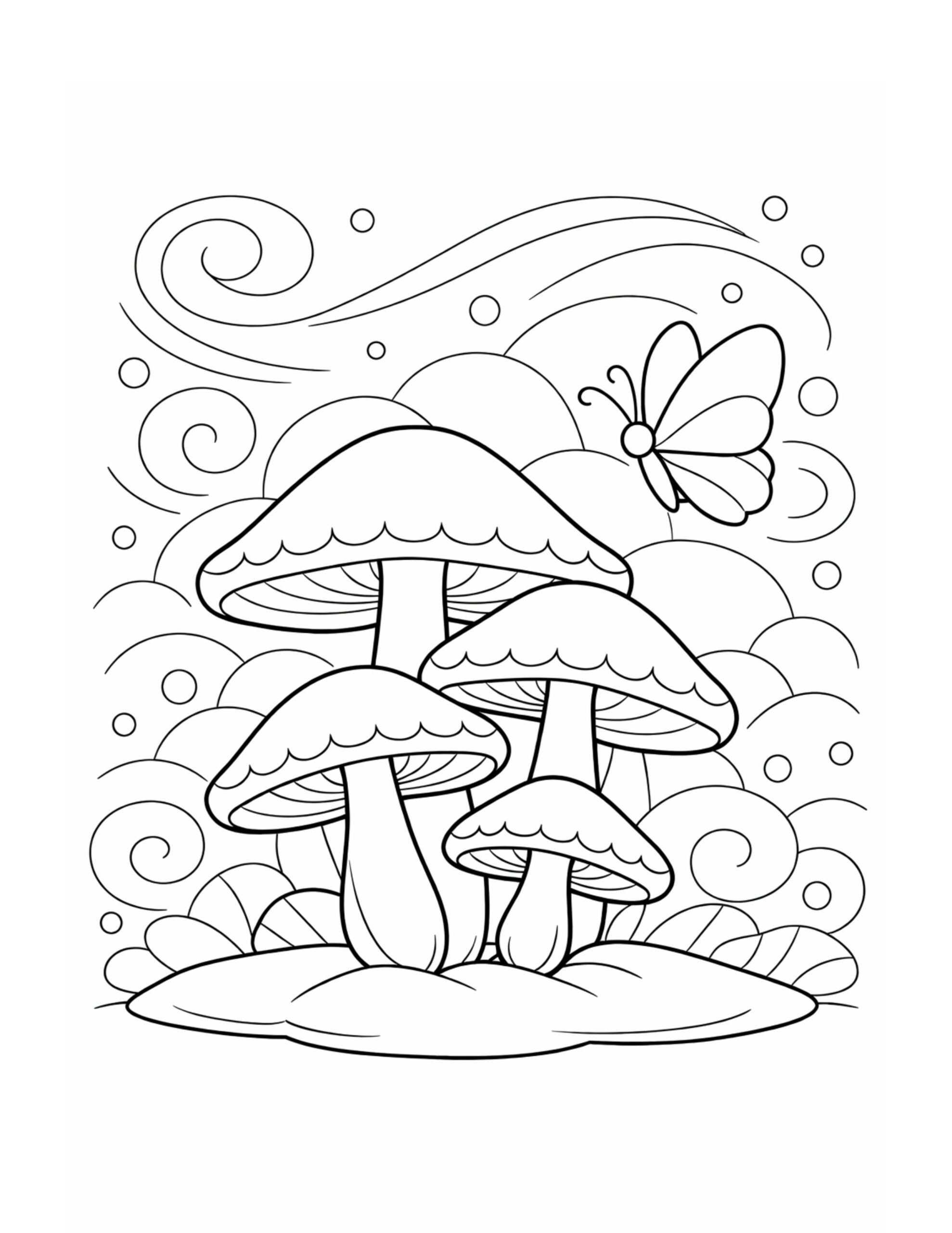 For this page, we entered the concept: “mushrooms with butterfly and swirls coloring page” on Colorin AI and generated a print ready coloring page in seconds.