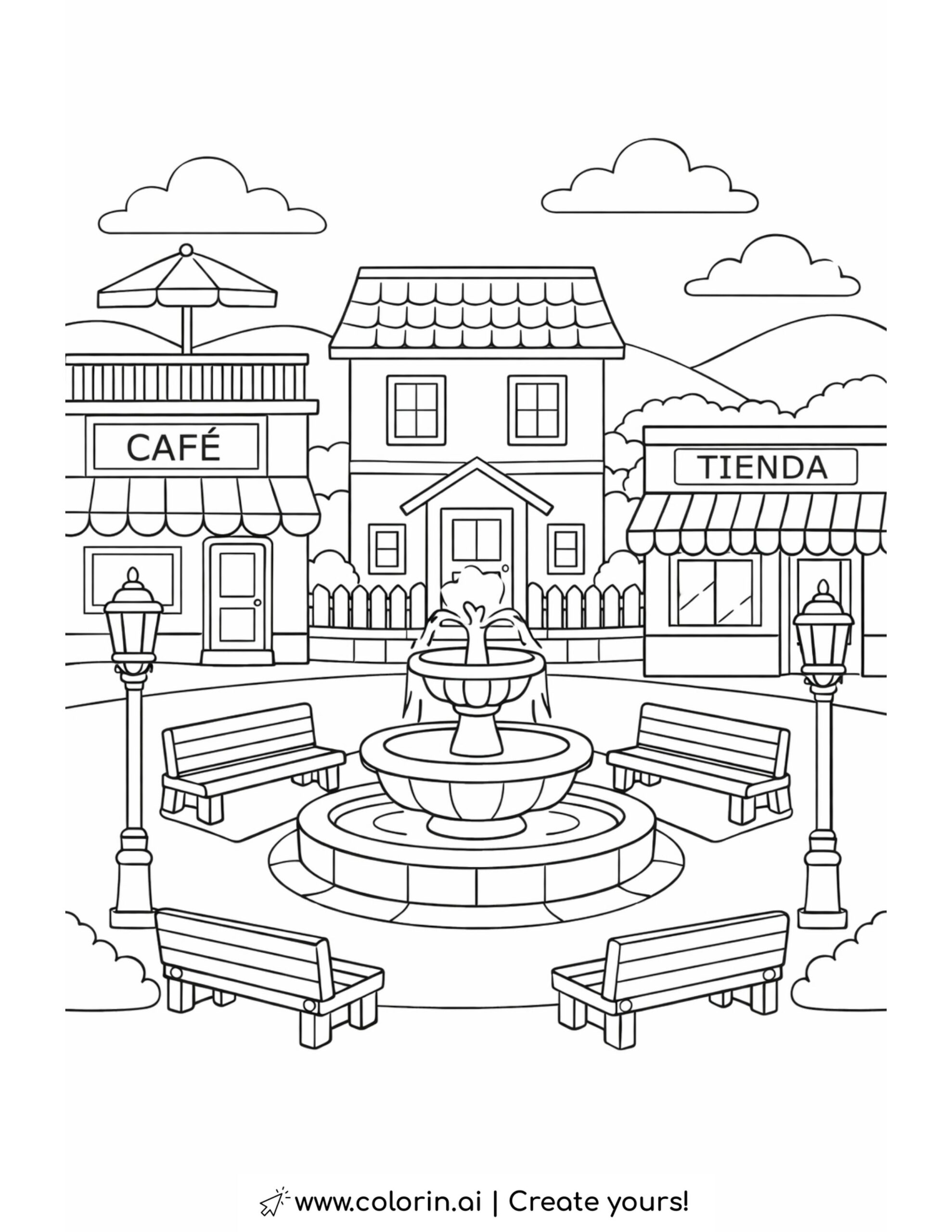 The neighborhood plaza with cafe and shop coloring page shows a cozy square with a central fountain surrounded by benches and classic street lamps. On one side, a café with a striped awning and upper terrace overlooks the plaza, while a small shop labeled “Tienda” stands nearby next to a simple residential house. This peaceful community scene feels welcoming and balanced, making it especially enjoyable to color.