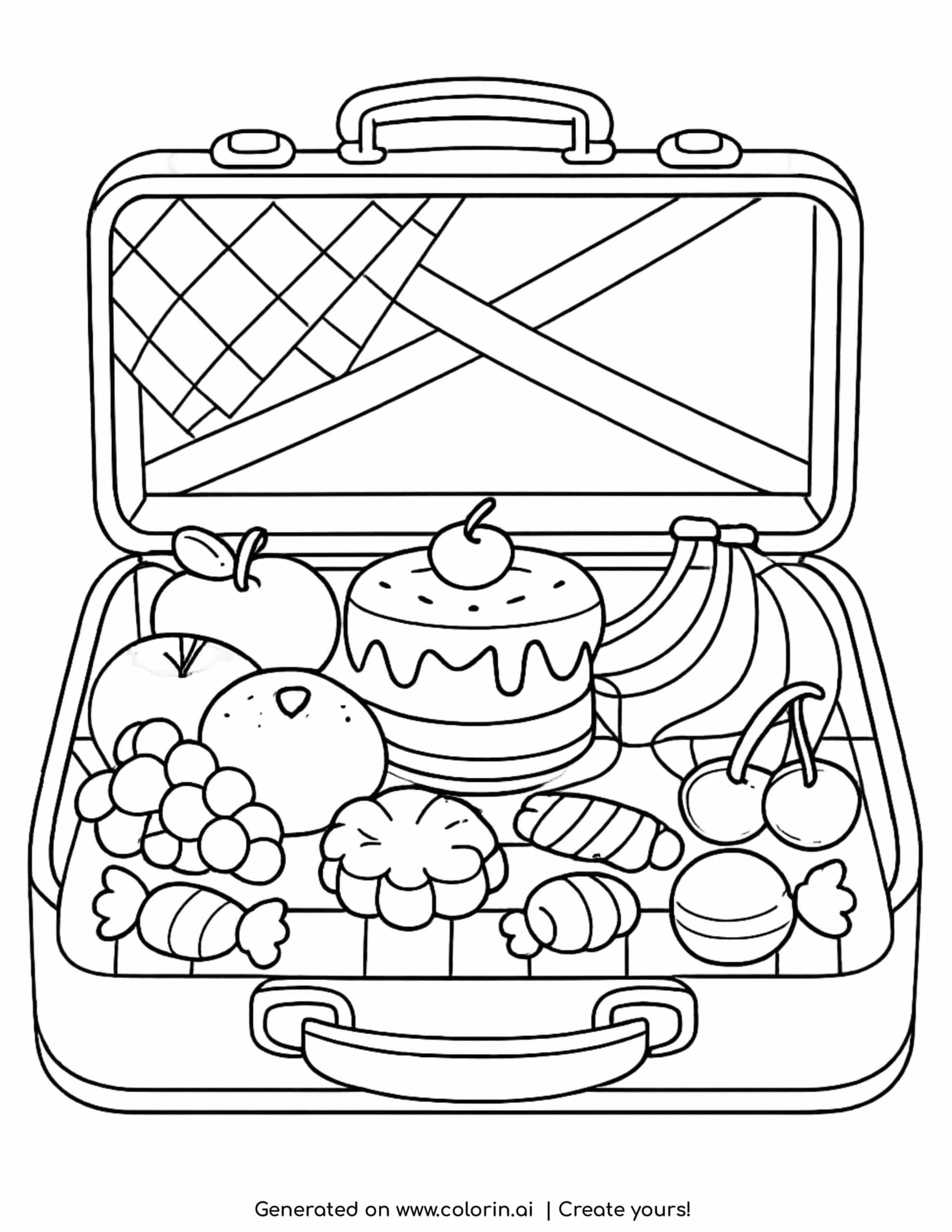 For this page, we entered the concept: open suitcase with picnic food coloring page on Colorin AI and generated a print ready coloring page in seconds.