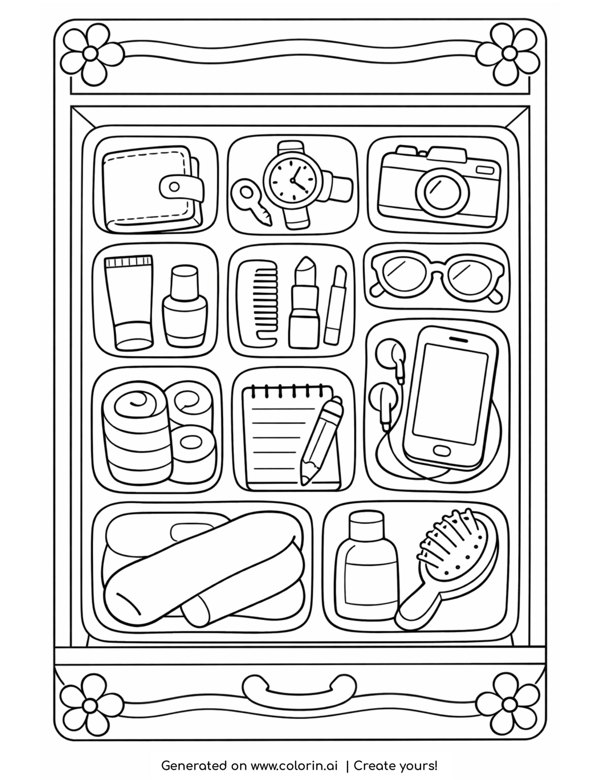 For this page, we entered the concept: organized drawer with personal items coloring page on Colorin AI and generated a print ready coloring page in seconds.
