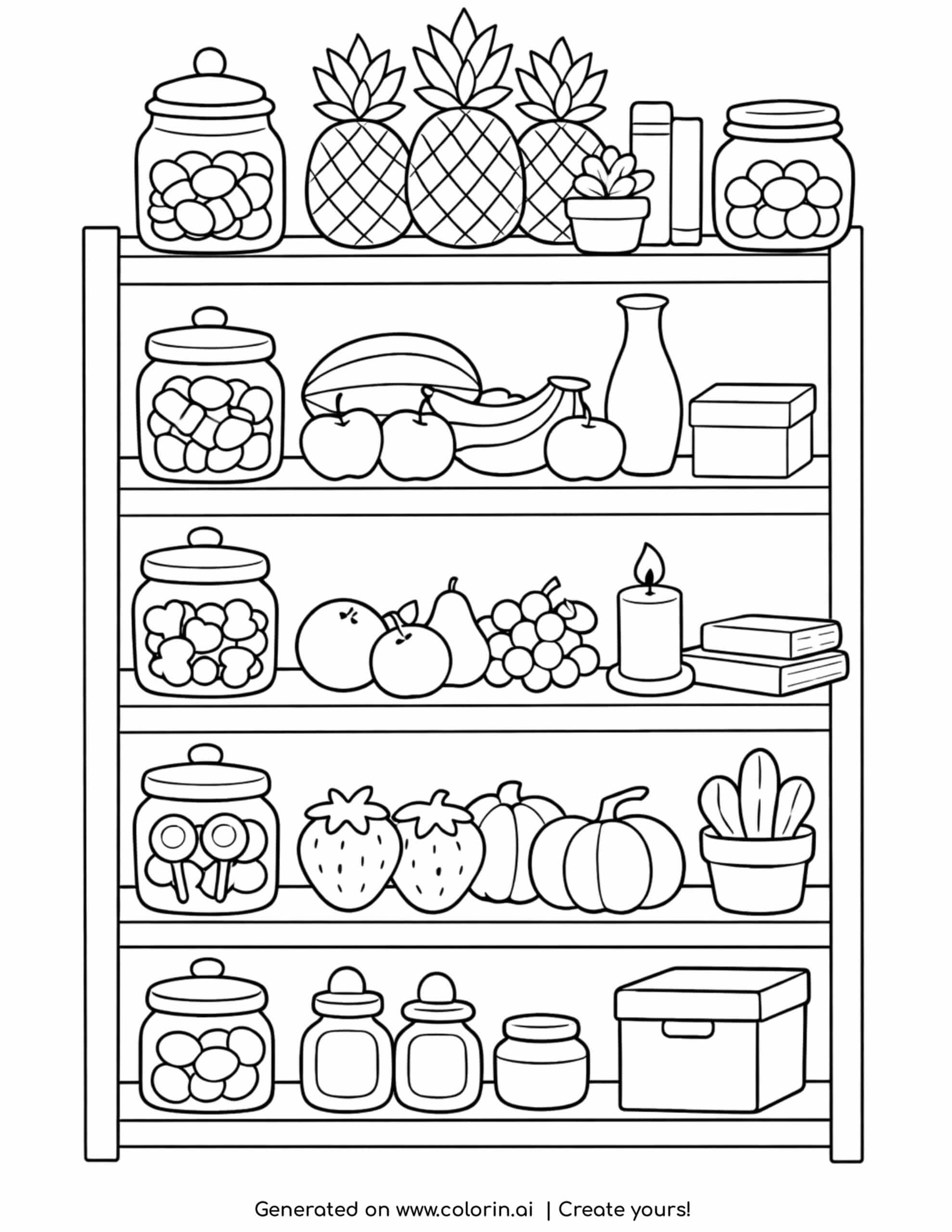 For this page, we entered the concept: pantry shelf with fruits jars and decor coloring page on Colorin AI and generated a print ready coloring page in seconds.