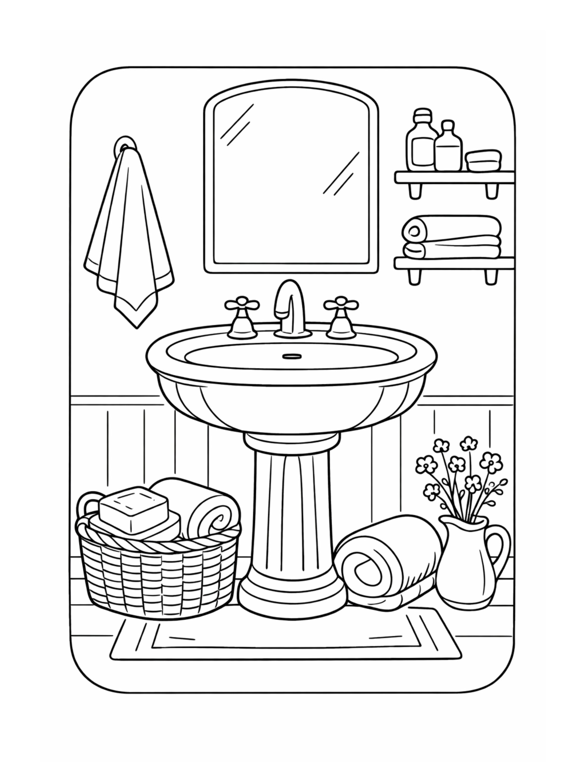 For this page, we entered the concept: “pedestal sink and towel shelves coloring page” on Colorin AI and generated a print ready coloring page in seconds.