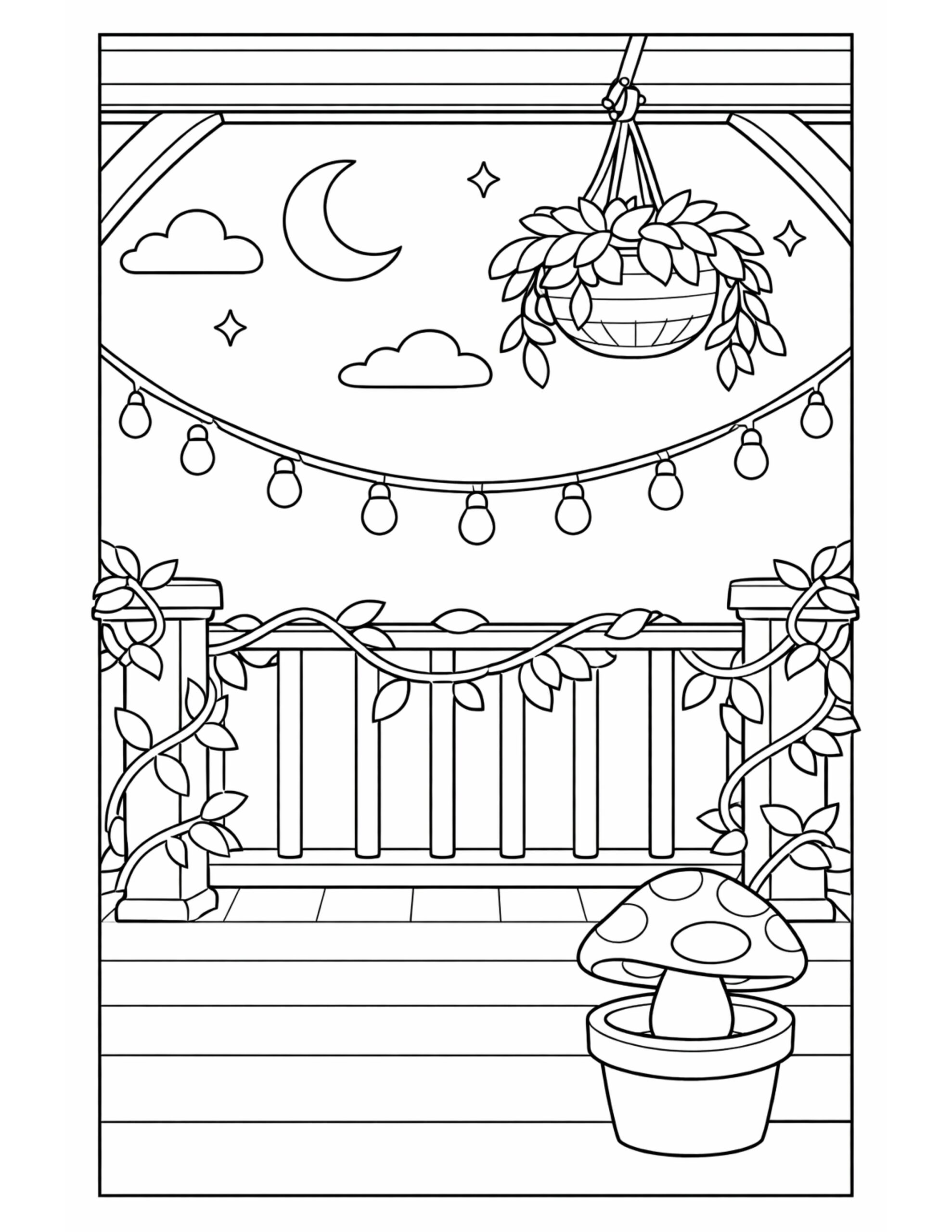 potted mushroom on moonlit balcony coloring page frames a cozy porch scene with twinkle lights, trailing vines, and a leafy hanging planter overhead. Meanwhile, a crescent moon and soft clouds float in the sky, giving everything a calm nighttime mood. Because the lines are clean and open, it’s easy to add shading and make the balcony feel warm and inviting.