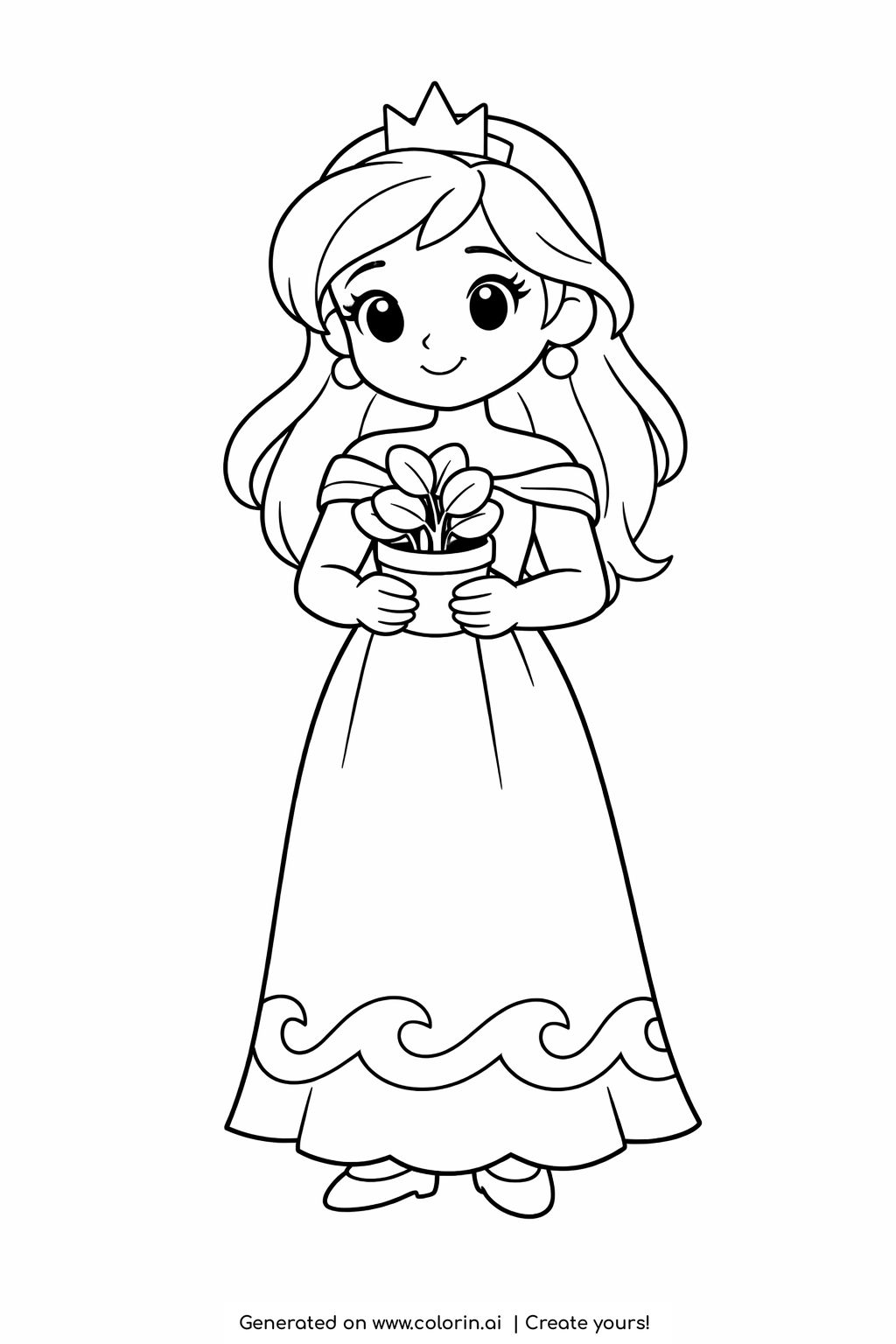 For this page, we entered the concept: princess holding a potted plant coloring page on Colorin AI and generated a print ready coloring page in seconds. Then we added gentle and delicate details to make the scene feel more alive, all in just a few minutes. You can follow the same process to create your own coloring pages, or build full coloring books without any design skills. For more creative inspiration, visit our profile on Pinterest.